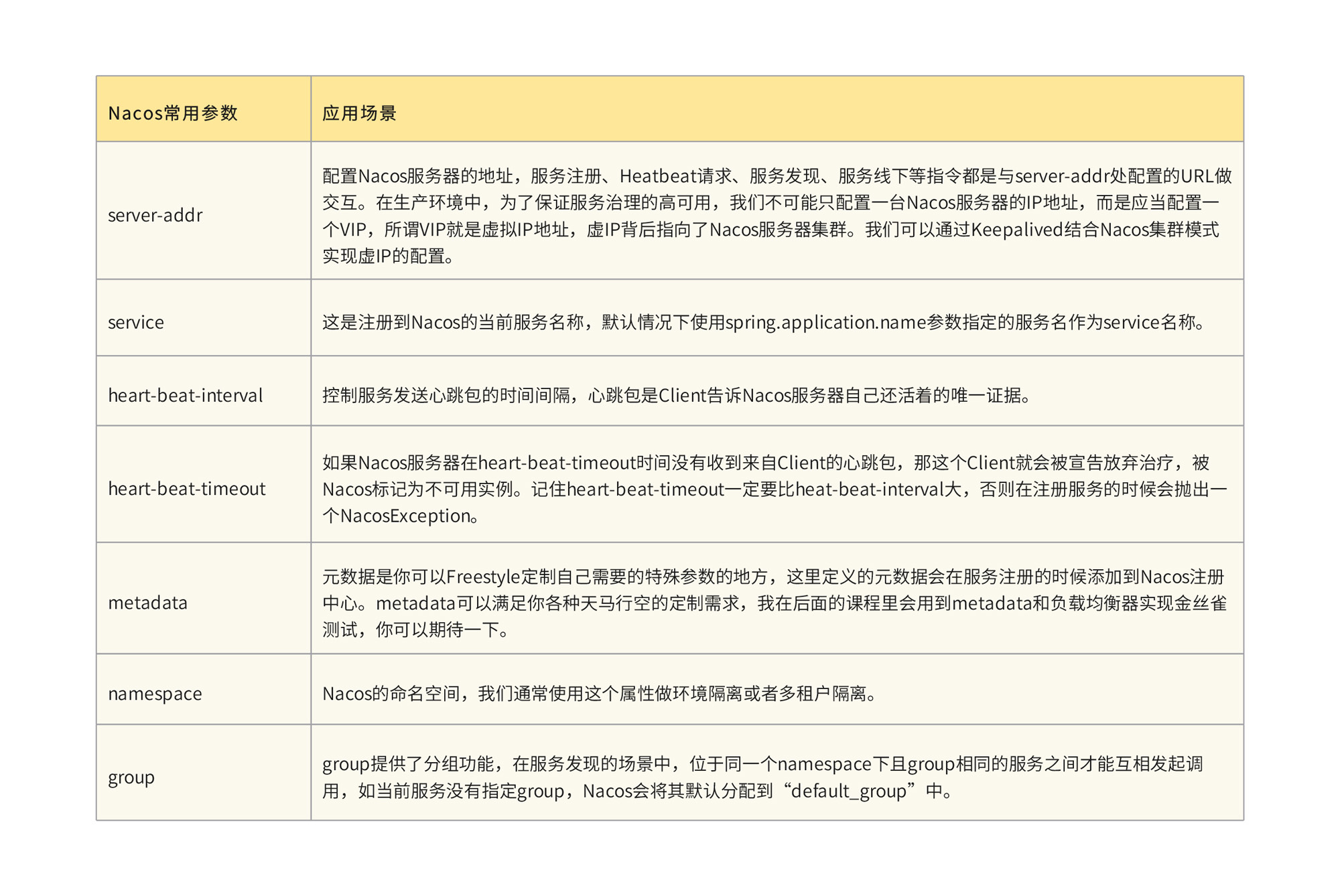我带你深入了解下上面的每个参数,以及它们背后的一些使用场景,掌握了这些Nacos的核心配置项,你就可以平稳驾驭Nacos服务治理了。