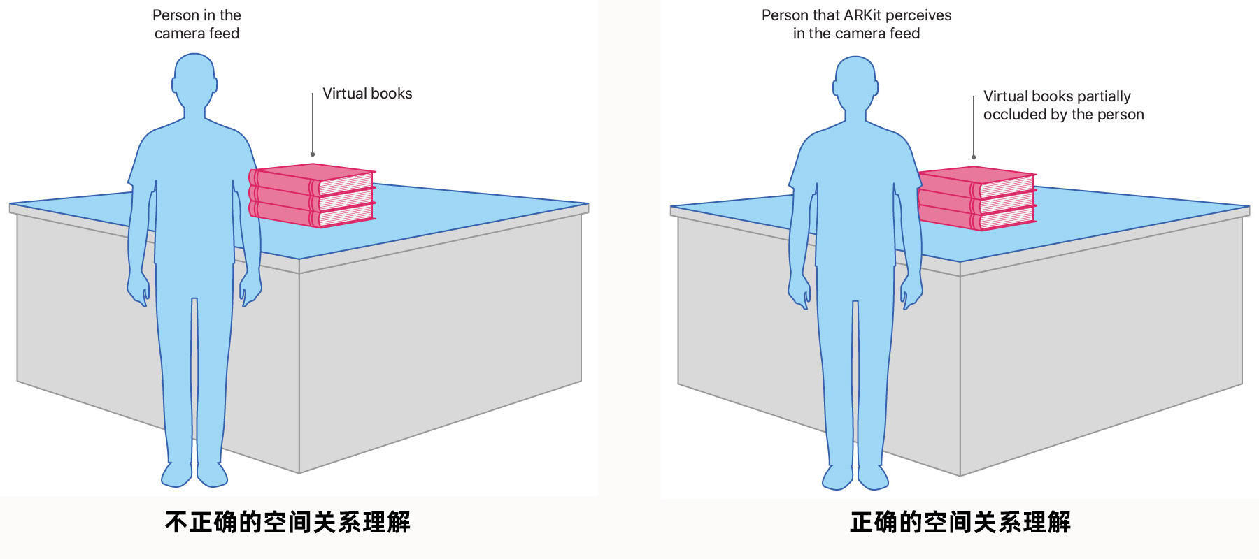 另外,用户放置的物体必须稳固在一个水平面中,或者悬挂在一个垂直平面上(除非物体是飞行物)。如果是有墙壁这样的垂直障碍物,虚拟物体绝对不能违背物理规律穿墙。比如下图左半部分就是不正确的空间关系理解。如果书放在桌子上,书被人的身体遮挡一部分才是符合空间认知的。