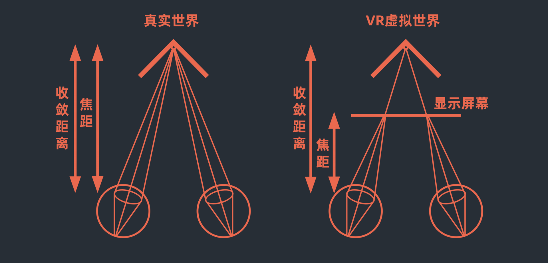 首先交互界面要和用户保持舒适的距离。在真实世界中,收敛距离和焦距是一致的,但在VR世界中则不然。因为VR眼镜中的屏幕距离眼球很近,焦距很短,这时如果虚拟元素放得太近,收敛距离和焦距差别就会很大,会产生聚散效应从而导致眼睛疲劳。当然个体之间存在差异,但是一般而言,建议将界面保持在2米~10米之间,人眼看着会舒服一些。