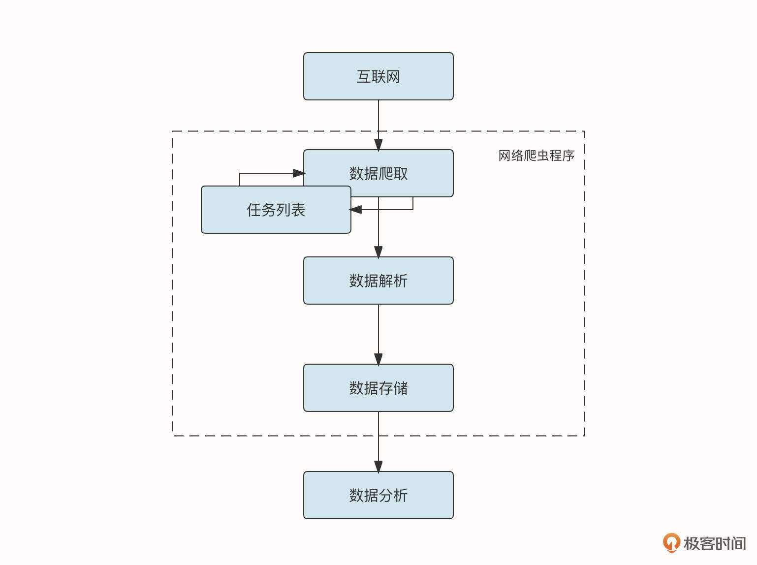 好了,畅想了这么久网络爬虫的价值,我们也来看看实现爬虫需要用到什么技术。一个典型爬虫程序的流程如下图所示,我们结合这个流程来看一下爬虫程序涉及到的技术栈。