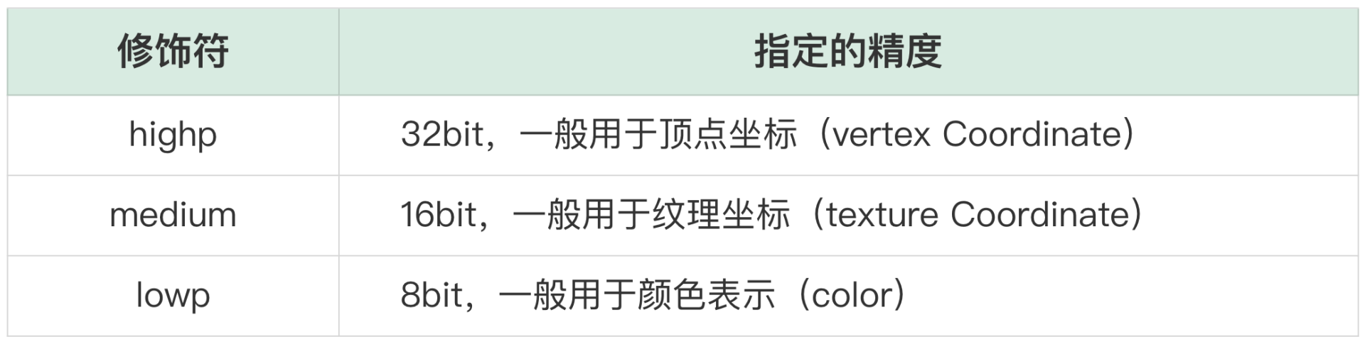 接着我们看一下**GLSL的基本数据类型:**int、float、bool,这些都是和C语言一致的,有一点需要强调的就是,GLSL中的float是可以再加一个修饰符的,这个修饰符用来指定精度。修饰符的可选项有三种: