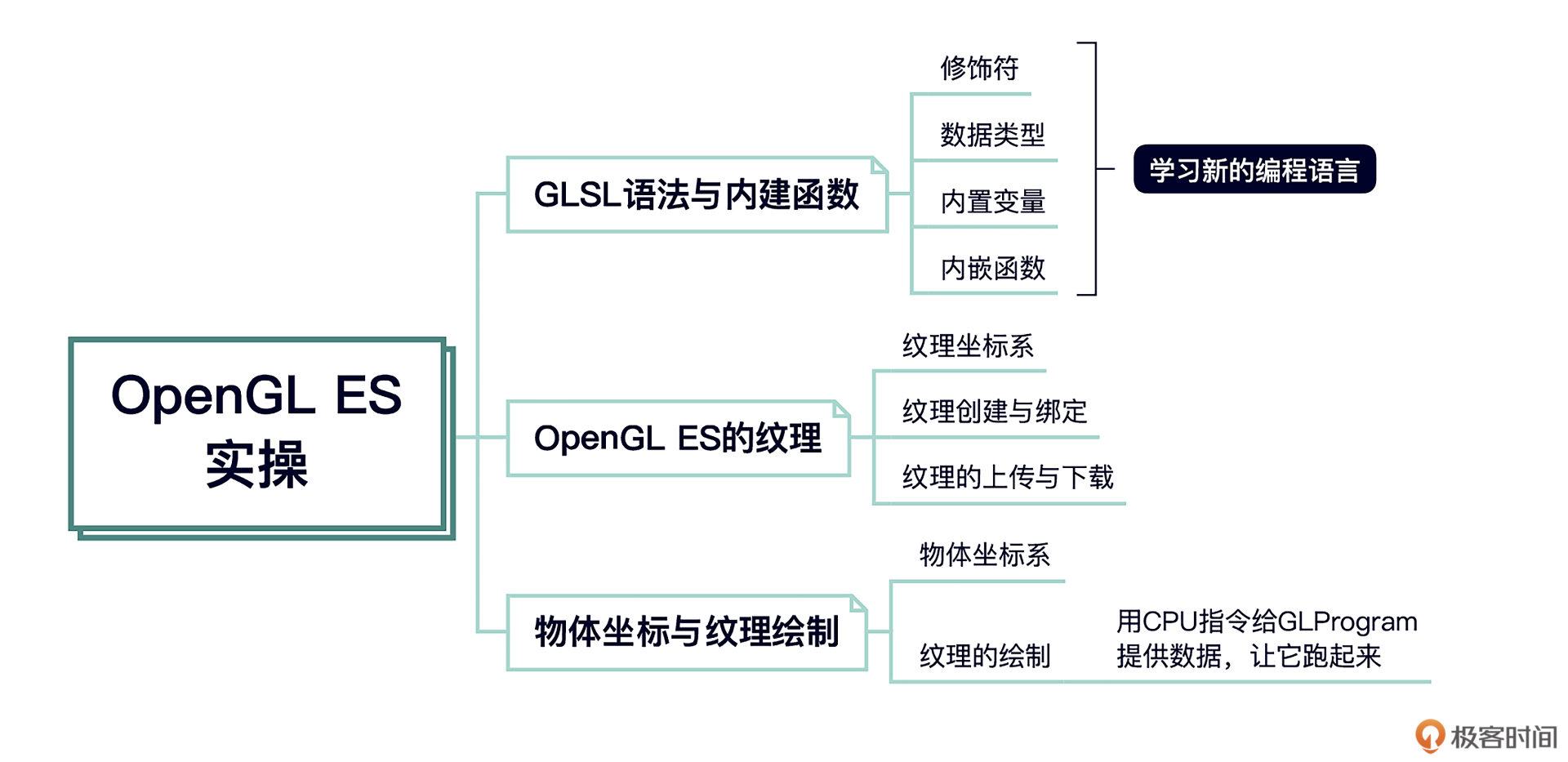 所以这个部分我带着你从它的概念、用途开始,然后逐步了解它内部的运行机制和GLSL语法,并且创建出了一个GLProgram,继而在各个平台上搭建出OpenGL ES的上下文环境,最后让这个GLProgram运行到了搭建的上下文环境中。你可以结合这个思维导图来回顾一下我们这部分的重点内容。