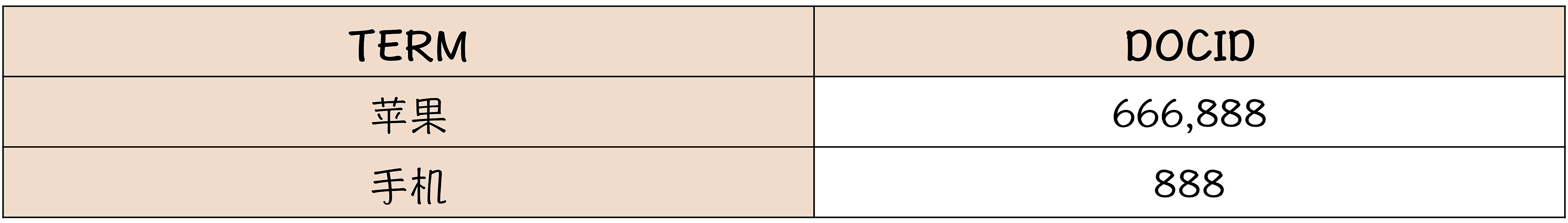 可以看到,这个倒排索引的表,它是以单词作为索引的Key,然后每个单词的倒排索引的值是一个列表,这个列表的元素就是含有这个单词的商品记录的DOCID。