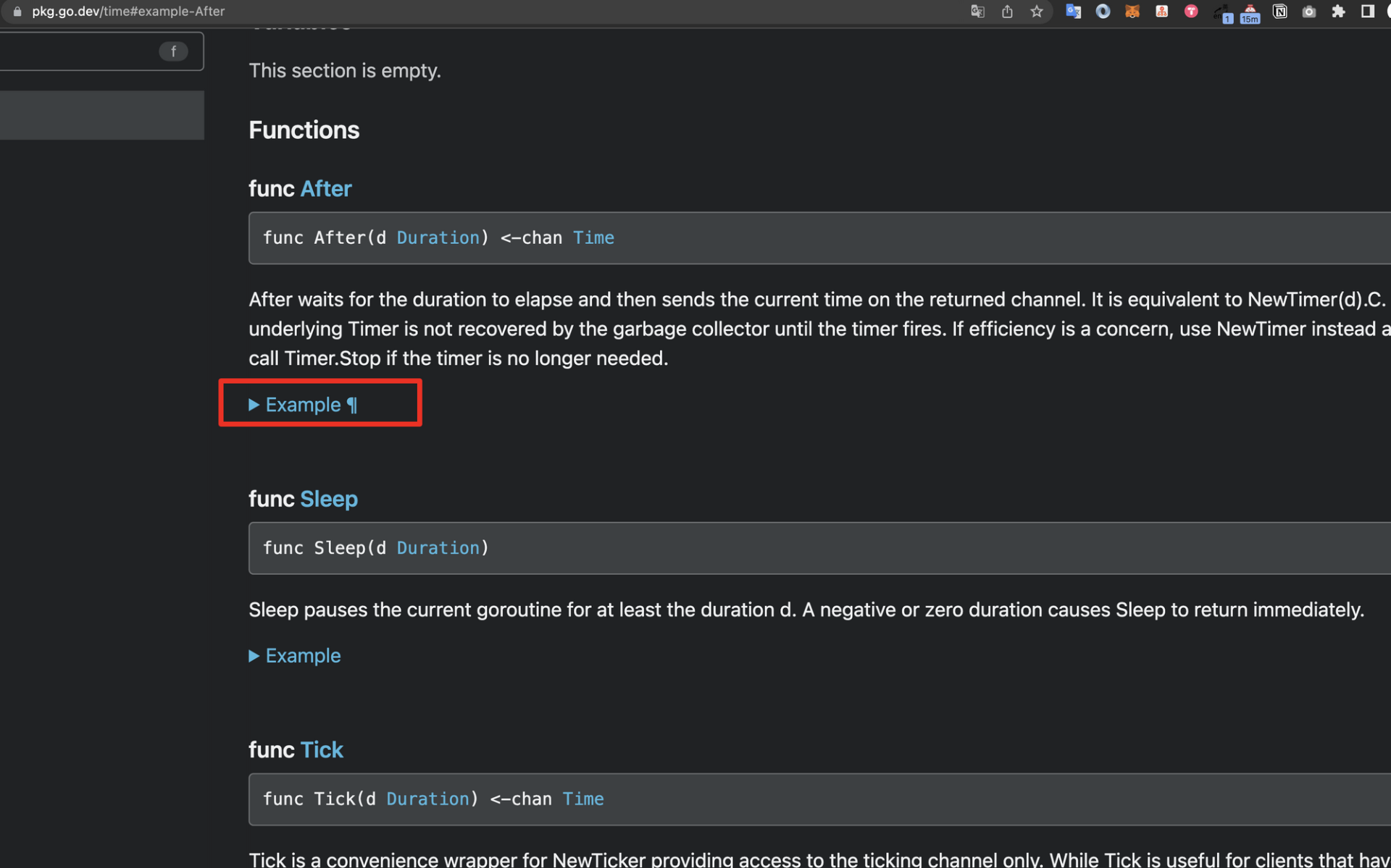 这里我模拟鼠标点击事件,给你做一个演示。假设我们访问Go time 包的说明文档,例如After函数,会发现下图的参考代码是折叠的。