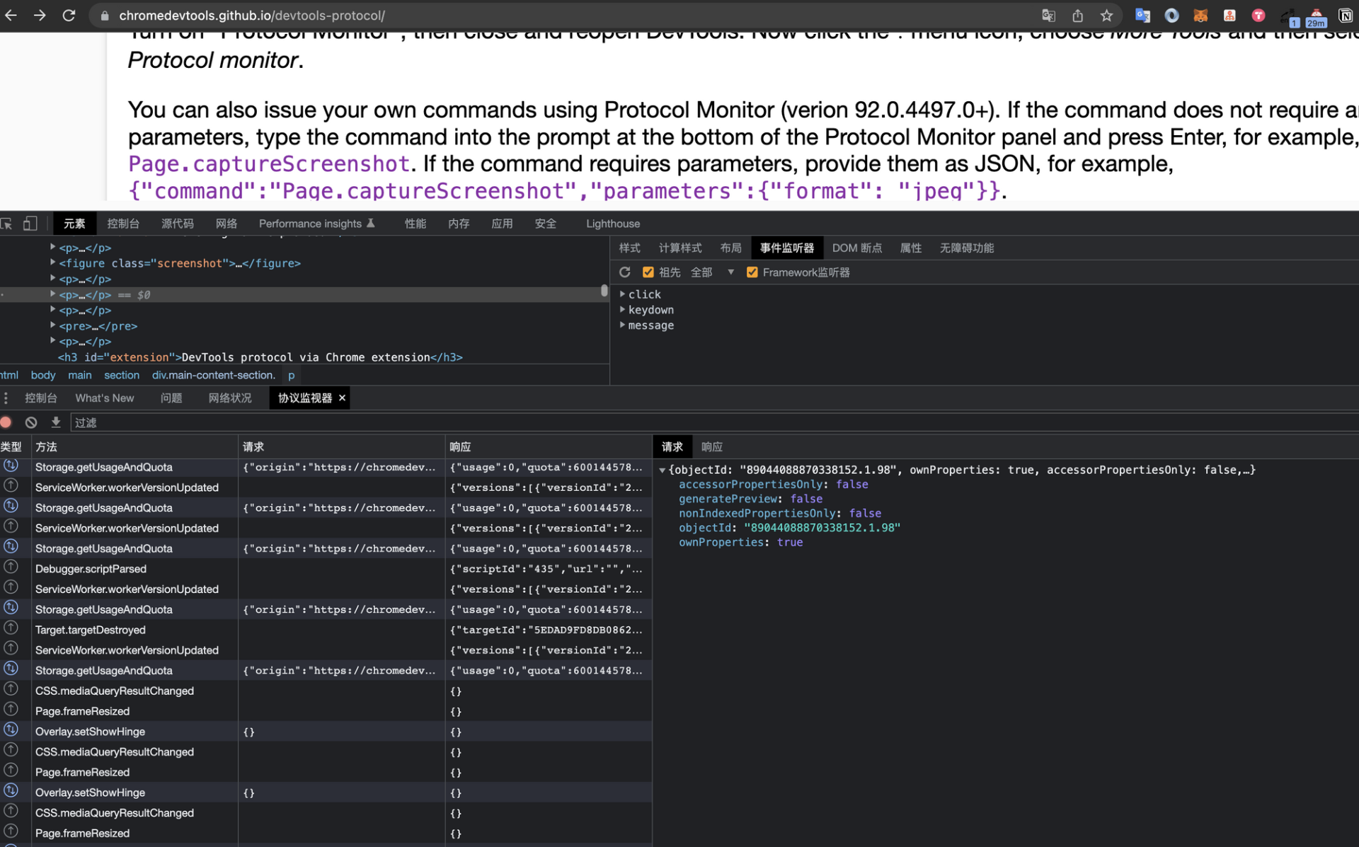 查看谷歌开发者工具与浏览器交互的协议的方式是,打开谷歌浏览器,在开发者工具 →设置→ 实验中勾选 Protocol Monitor(协议监视器)。
