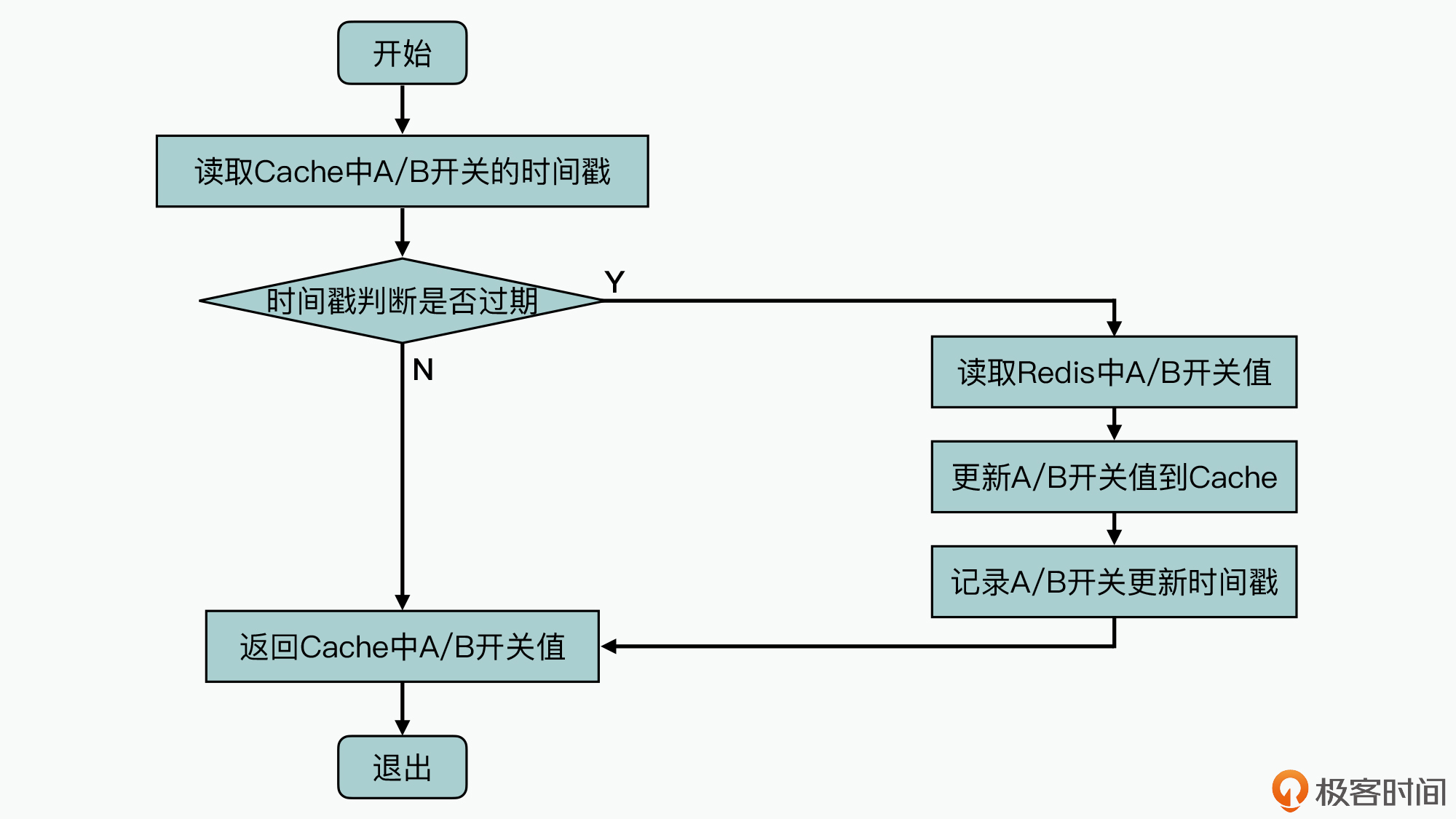 如图中所示,首先读取内存Cache中A/B开关值的时间戳,然后基于时间戳判断,这个Cache中数据是否已经过期(这里配置过期时间暂定5s)。如果没有过期的情况下,系统可以直接返回Cache中记录的A/B开关值;否则的话,就需要重新读取Redis中的A/B开关配置信息,更新到Cache中并记录更新时间戳,然后再返回新读取到的A/B开关值。
