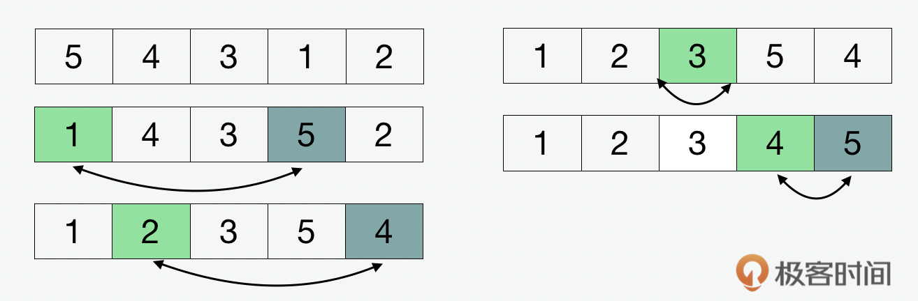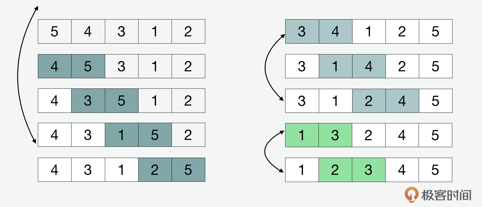 首先,我们先来看看理论类的冒泡、选择这两种排序算法。这两种方式用的都是一种比较和交换的方法(compare and swap)。我们上面说过,对于数组来说,如果我们在非队尾的位置插入的话,就容易造成队列中插入的元素以后的一系列元素的移动。但是如果使用交换的方式,就巧妙地避免了这个问题。