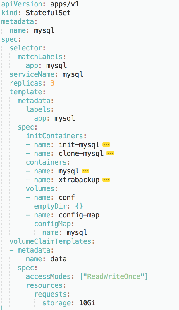 这个StatefulSet的replicas值是3,表示它定义的MySQL集群有三个节点:一个Master节点,两个Slave节点。