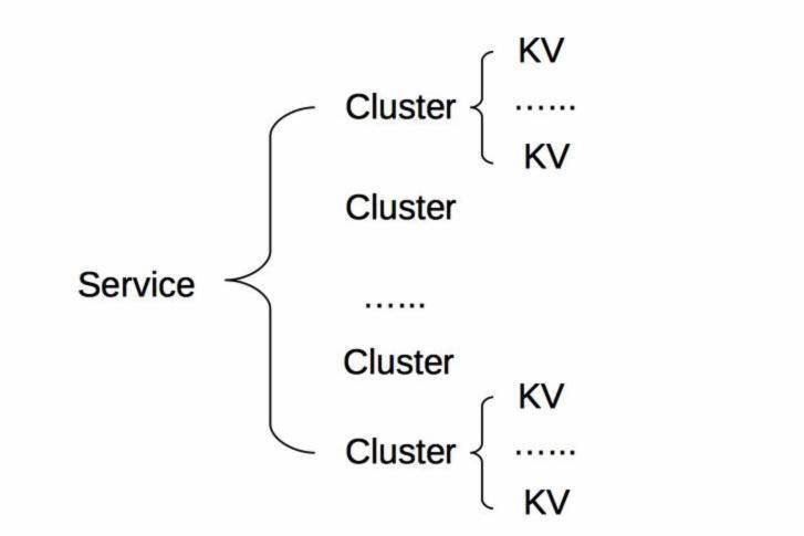 具体存储的时候,一般是按照“服务-分组-节点信息”三层结构来存储,可以用下图来描述。Service代表服务的具体分组,Cluster代表服务的接口名,节点信息用KV存储。