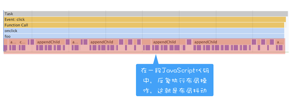 将新的元素添加到DOM之后,我们又调用了main_div.offsetHeight来获取新main_div的高度信息。如果要获取到main_div的高度,就需要重新布局,所以这里在获取到main_div的高度之前,JavaScript还需要强制让渲染引擎默认执行一次布局操作。我们把这个操作称为强制同步布局。
