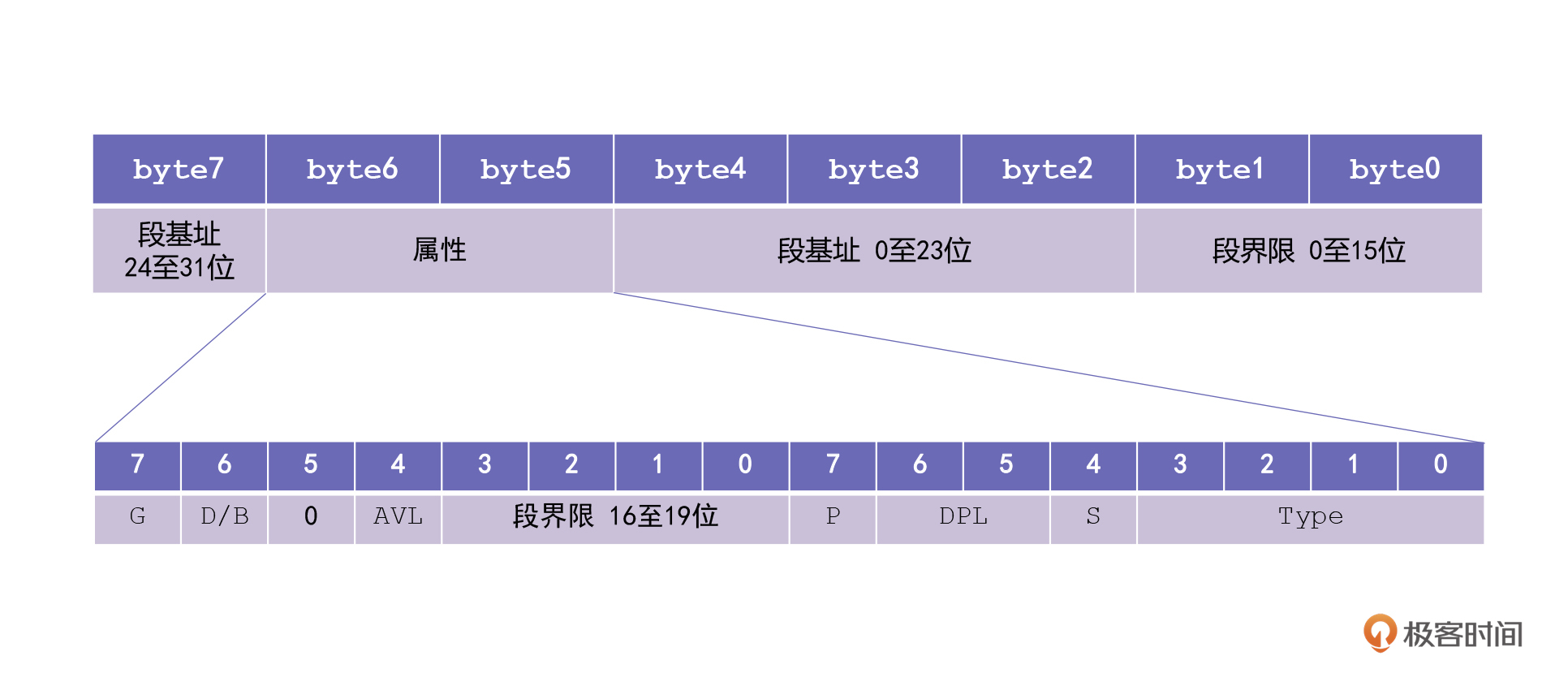 然后是G位,它指的是定义段颗粒度(Granularity),它的值为0时,段界限的单位是字节,为1时段界限以4KB为单位,也就是一页。