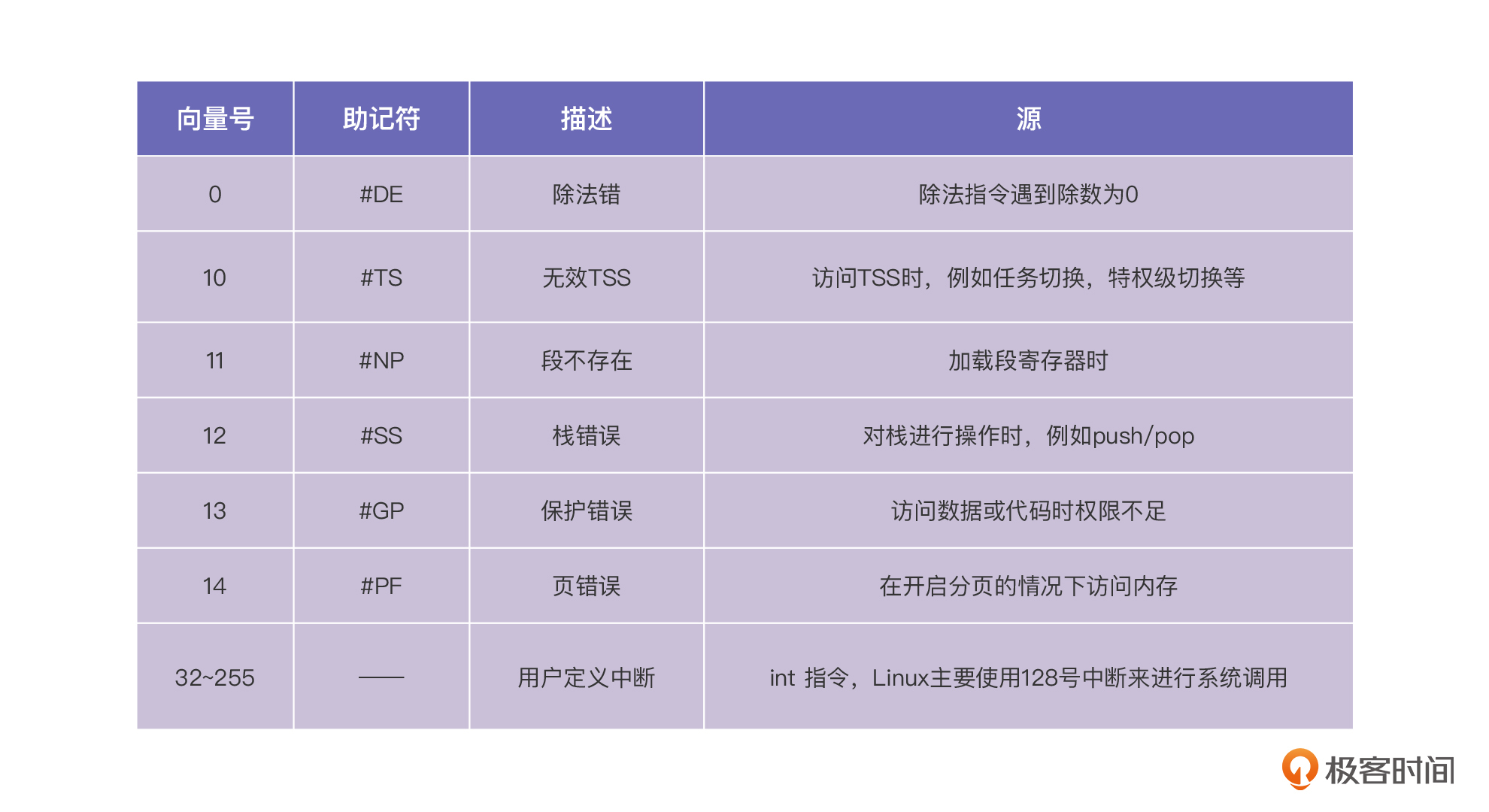 IDT的基地址存储在idtr寄存器中,这和GDTR的设计如出一辙。每个中断都有一个编号与其对应,我们称之为中断向量号。中断向量号是CPU提前分配好的,我也把比较重要的中断向量号放在了下表里,你可以看看。