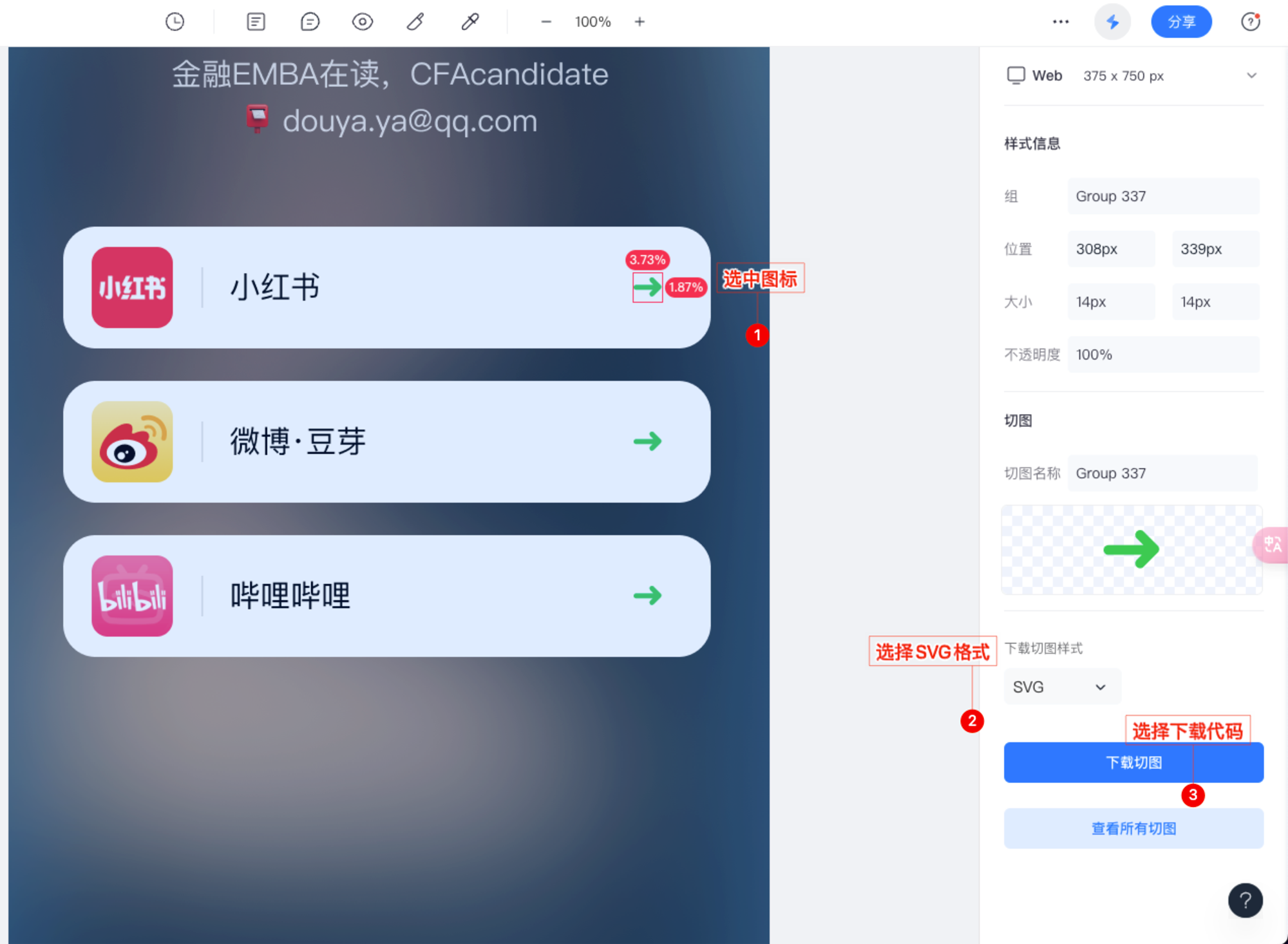 在这种情况下,我们可以使用如蓝湖这类的设计平台,将 Icon 图标导出为SVG代码。以下图示只需三步即可完成SVG代码的下载。