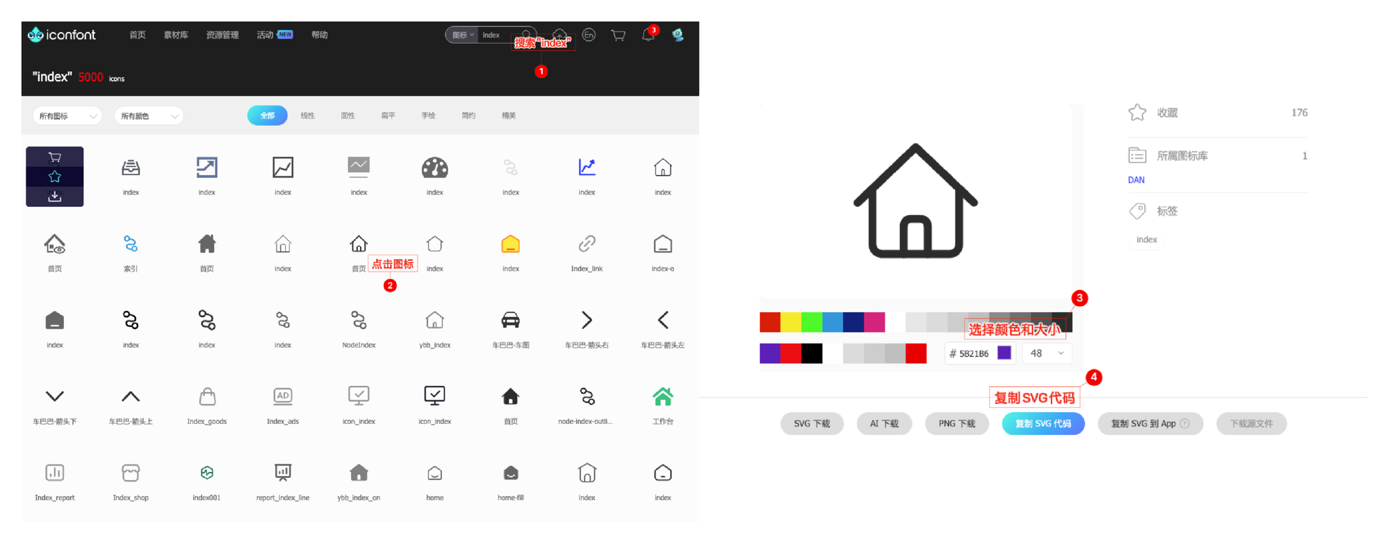 比如,我经常使用的是iconfont.cn。通过下面的示图中的四个步骤,你就可以得到图标的SVG代码。