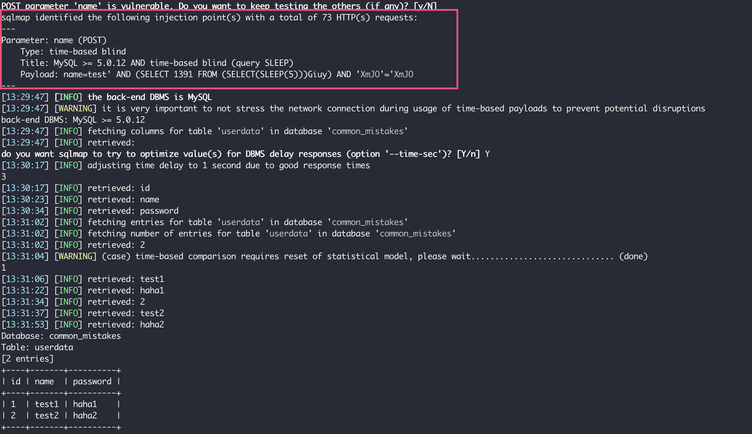 <select id="findByNamesWrong" resultType="org.geekbang.time.commonmistakes.codeanddata.sqlinject.UserData"> SELECT id,name FROM `userdata` WHERE name in (${names}) </select>