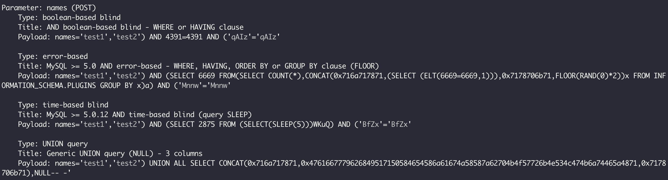 但是,这样直接把外部传入的内容替换到IN内部,同样会有注入漏洞: