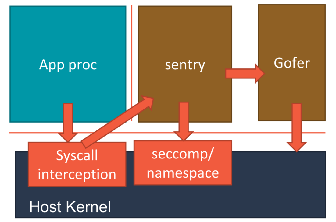 可以看到,在这种实现里,Sentry 并不会真的像虚拟机那样去虚拟出硬件设备、安装 Guest 操作系统。它只是借助 KVM 进行系统调用的拦截,以及处理地址空间切换等细节。