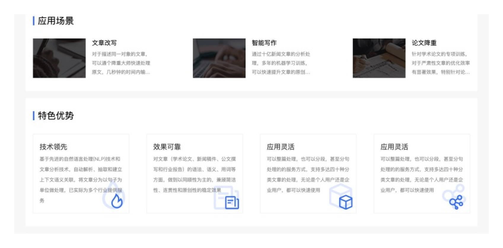 特别注意 “论文降重”这个功能,原来这个项目最开始的核心功能是论文降重,这样就不难理解了,因为该项目在论文降重这个功能上已经做到了头部,现在AI浪潮来了,这个功能很快就可以转到AI改写上,现在这个网站也不仅仅提供论文降重,也提供文章改写、AI写文章等,而论文降重仍然是它核心盈利的功能。