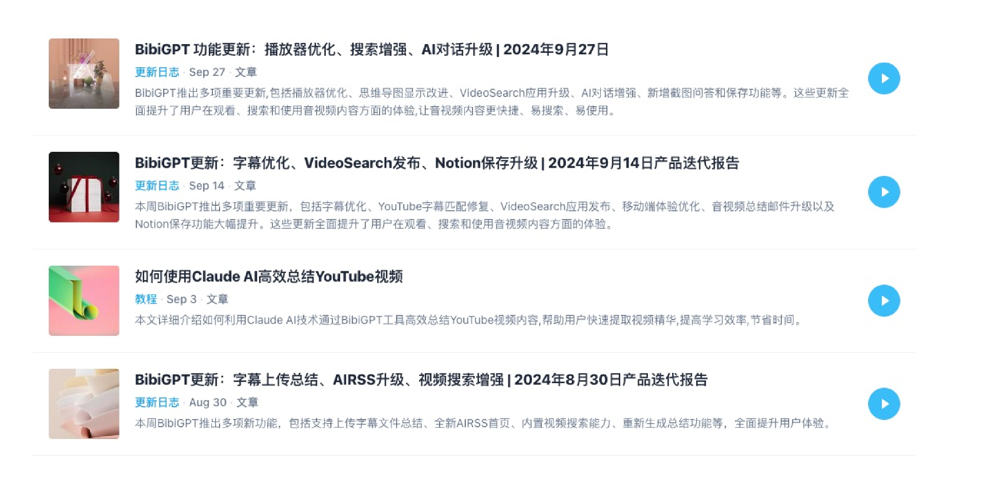 这个项目名称叫:BibiGPT,一开始这个AI项目就完成了一个简单的功能,做B站视频的总结,整理成思维导图,发展了一年之后已经成为一个可以总结,整理和编辑所有互联网视频的编辑平台。为什么我说这个项目非常成功呢?你可以看看它最新的更新日志。