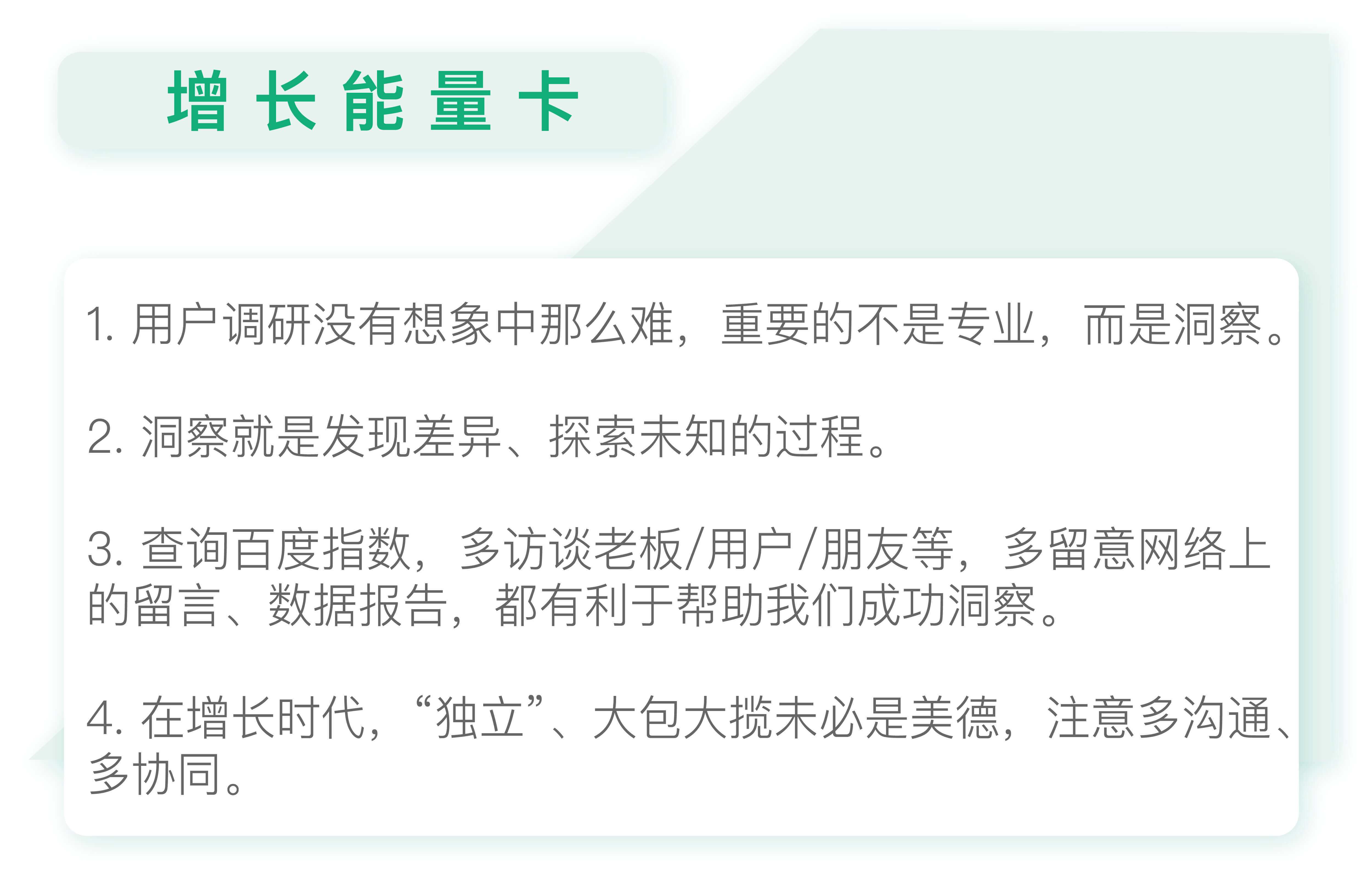 通过这两个例子,我们可以发现,通过简单的方式或关键的行为,就可能洞察到巨大的机会成为未来的增长爆破点。反而是看似专业的调研过程和冗长的报告,价值未必明显。