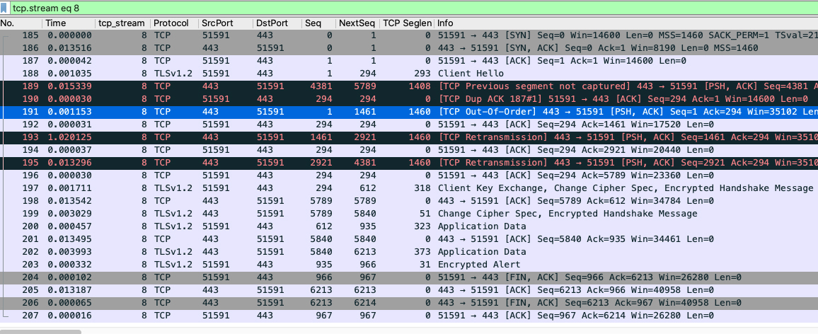 一眼看去,整串数据流确实有点问题,因为有好几个被Wireshark标注红色的报文。我们重点关注下189、190、191、193、195这几个报文。