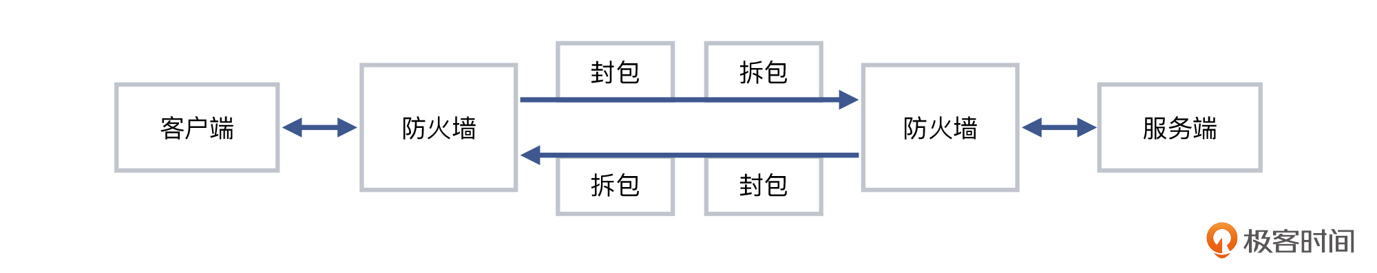 - 在客户端和服务端之间,各有一道防火墙,两者之间设立有隧道;