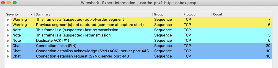 理解了这几个严重级别所代表的含义之后,我们还是回到Expert Information的进一步解读上来。点击Warning左边的小箭头,展开乱序的报文集合,我们就能看到这些报文的概览信息,如下所示: