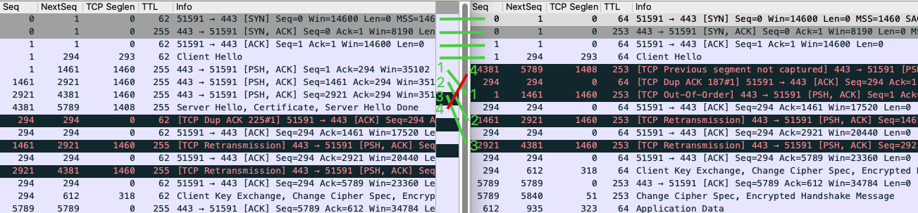 左侧是服务端抓包,右侧是客户端抓包。前4个报文的顺序没有任何变化,但服务端随后一口气发送的4个包(这里叫它们1、2、3、4吧),到了客户端却变成了4、1、2、3!这也就是Wireshark提示我们的: