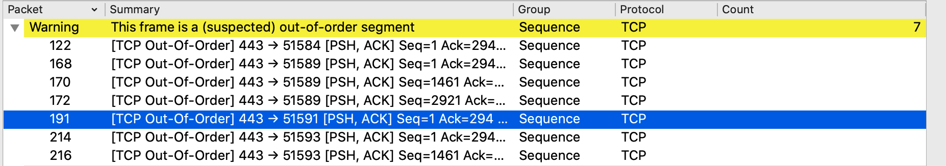 - 191:服务端(HTTPS)给客户端的报文,是TCP Out-of-Order,即乱序报文。