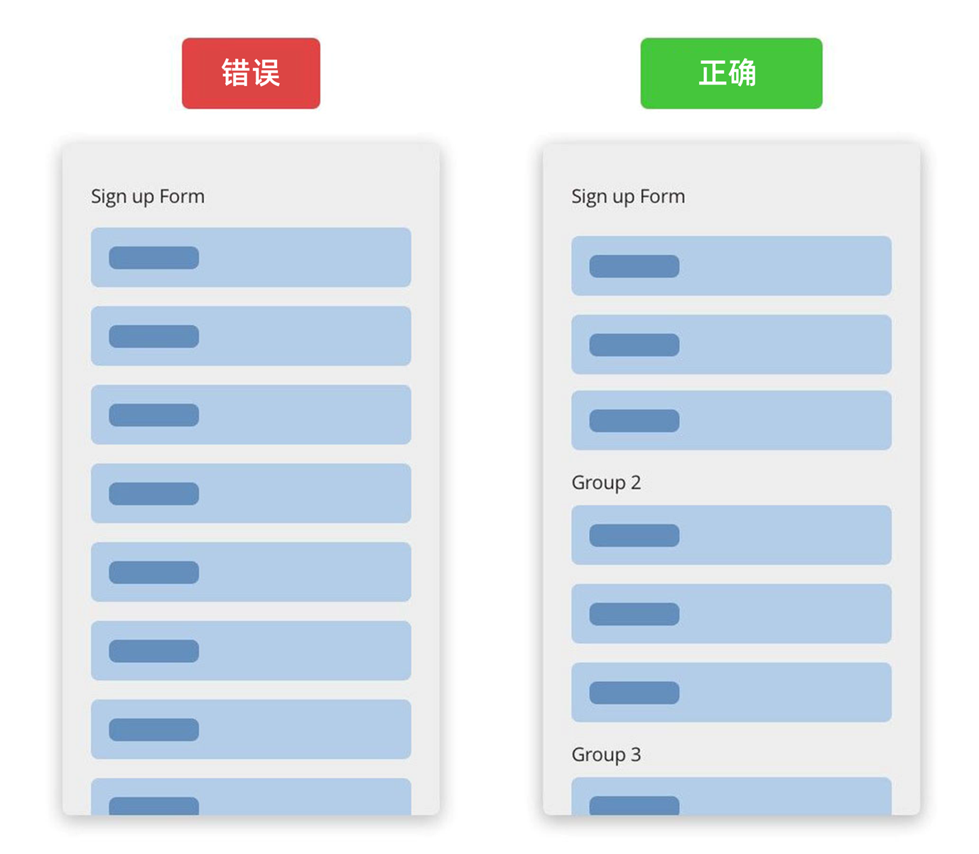 如果存在较多的选项内容,请分组分块。如果你将每组选项控制在4个左右,这样可以帮助我们更轻松地进行短期记忆。比如下面左边的列表和右边的分组相比,显然右边的更容易被理解。