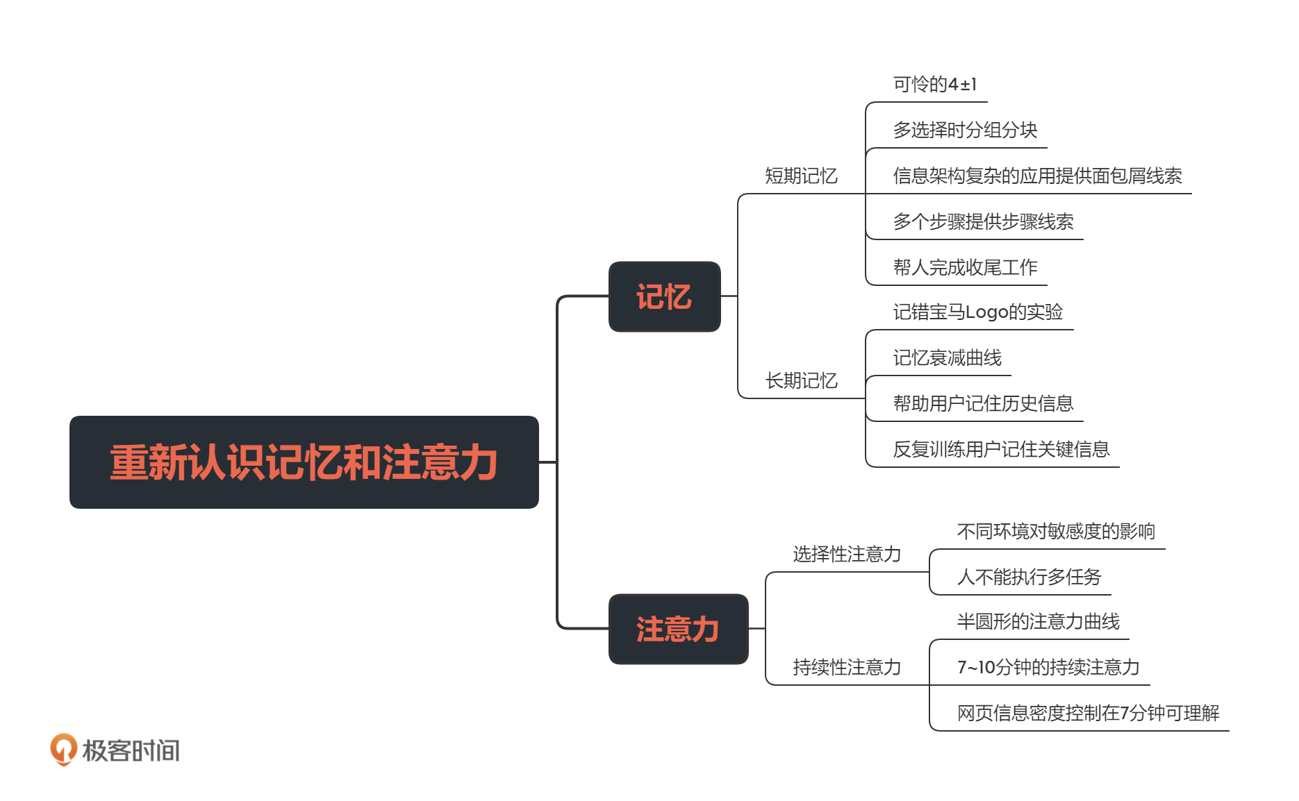 为了方便你的理解,我还给你总结了一个脑图,你可以长按保存下来,对你理解在设计中如何考虑人的记忆和注意力会很有帮助。