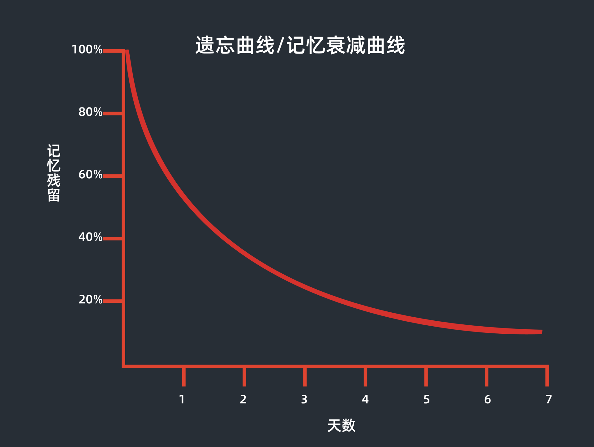 为什么会这样呢?如果把我们的大脑类比为计算机,人脑的记忆处理是用压缩率非常高的失真算法处理过后再存储的。我们大脑存储的是大致的轮框,而且这个轮框还会随着时间的增加而迅速衰减。你从下面的记忆衰减曲线可以很明显看出,一周之后能记住的框架也仅仅是10%了。