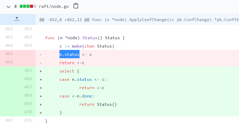 不幸的是,如果正好节点停止了,没有goroutine去填充这个chan,会导致方法hang在返回的那一行上(下面的截图中的第466行)。解决办法就是,在等待status chan返回元素的同时,也检查节点是不是已经停止了(done这个chan是不是close了)。