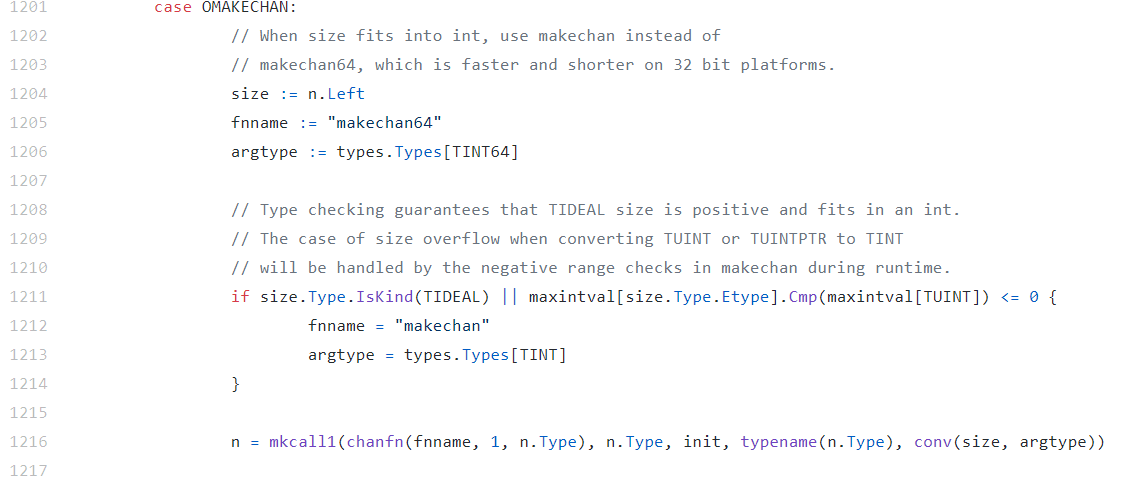 下面的代码是处理make chan的逻辑,它会决定是使用makechan还是makechan64来实现chan的初始化: