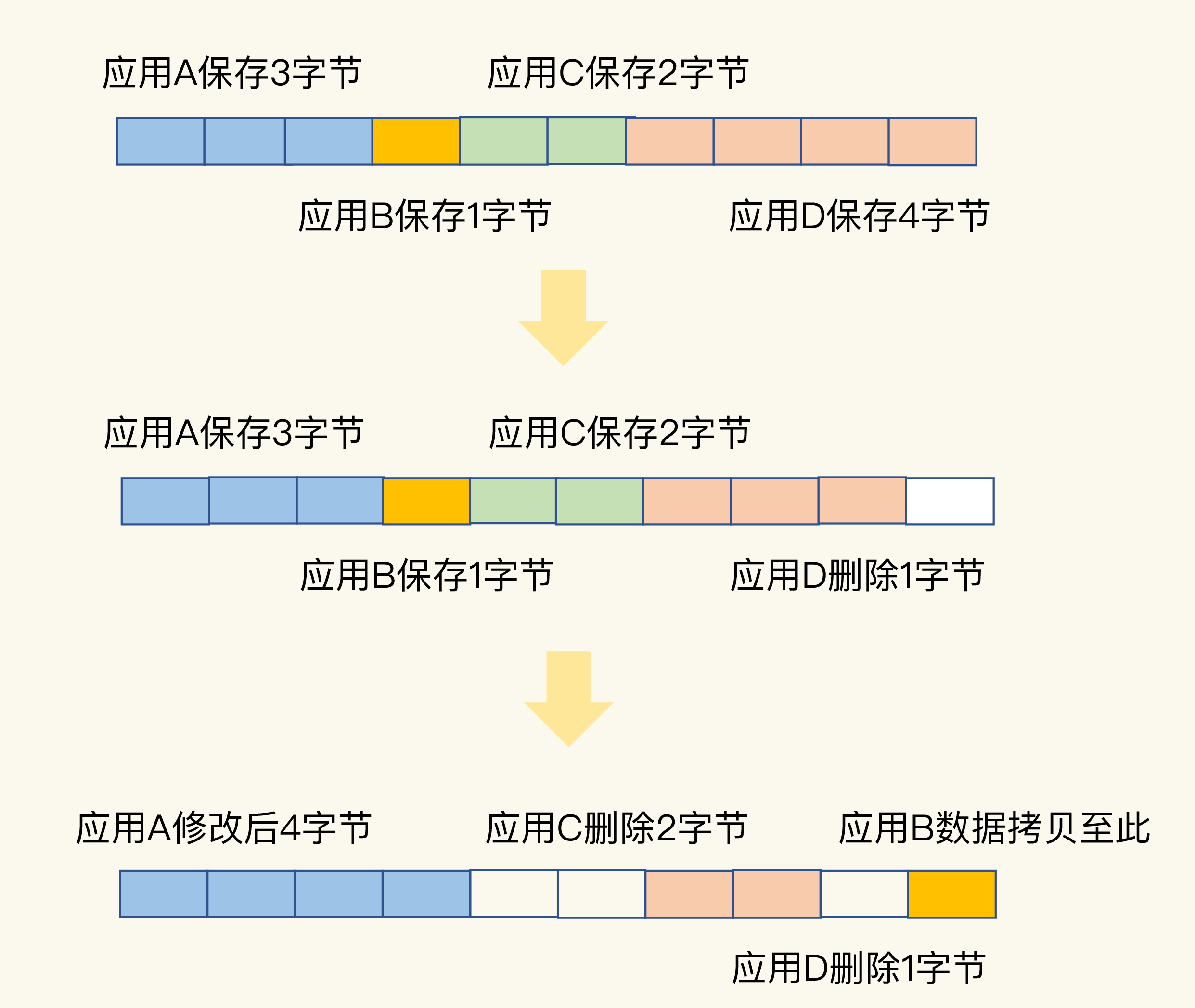 一开始,应用A、B、C、D分别保存了3、1、2、4字节的数据,并占据了相应的内存空间。然后,应用D删除了1个字节,这个1字节的内存空间就空出来了。紧接着,应用A修改了数据,从3字节变成了4字节。为了保持A数据的空间连续性,操作系统就需要把B的数据拷贝到别的空间,比如拷贝到D刚刚释放的空间中。此时,应用C和D也分别删除了2字节和1字节的数据,整个内存空间上就分别出现了2字节和1字节的空闲碎片。如果应用E想要一个3字节的连续空间,显然是不能得到满足的。因为,虽然空间总量够,但却是碎片空间,并不是连续的。