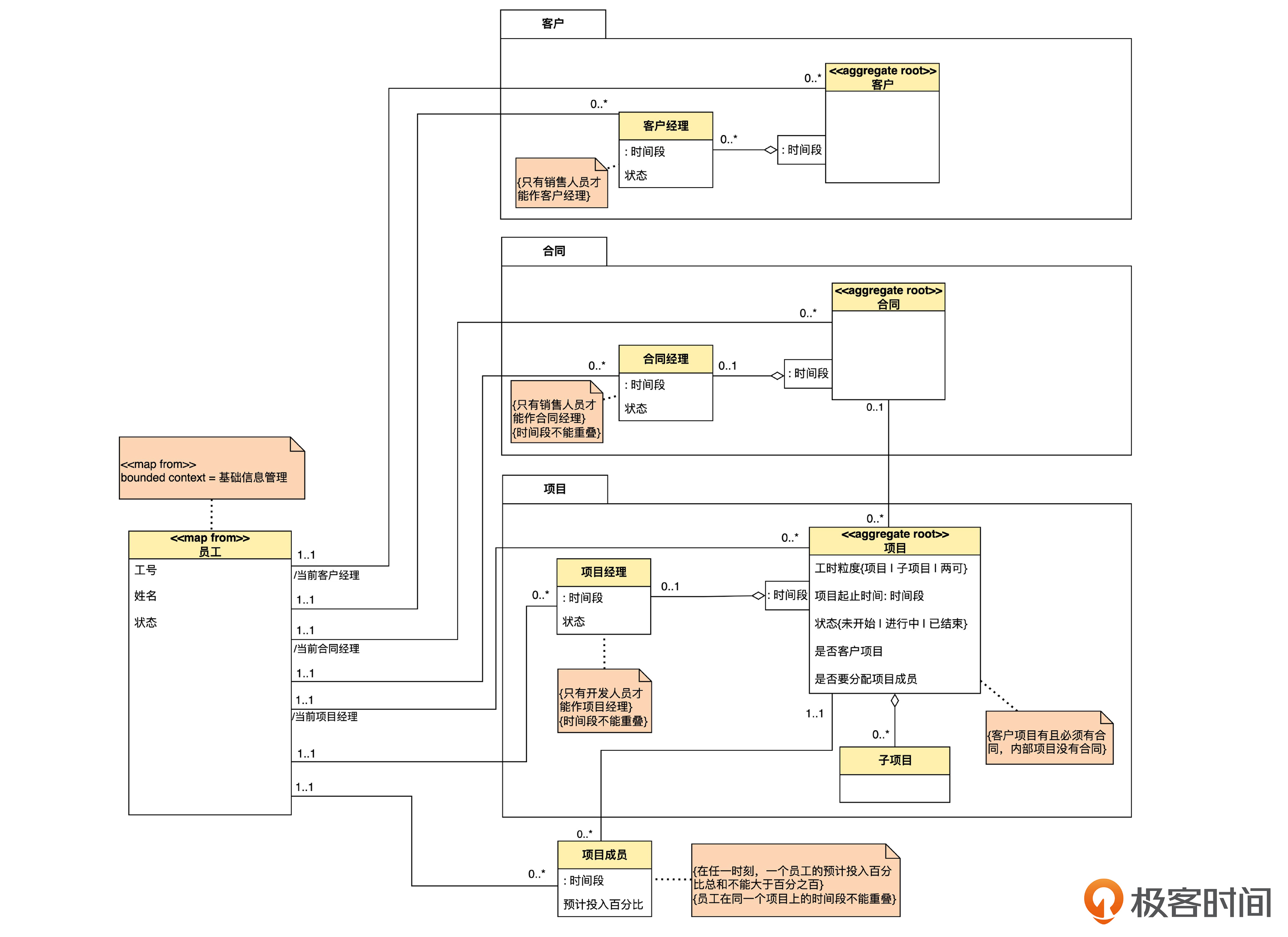 所以,项目管理的模型图里面也要画出员工这个实体。但是,项目管理中的员工是从基础信息管理上下文里“映射”过来的。两个上下文之间的这种映射关系,就叫做上下文映射(context map)。