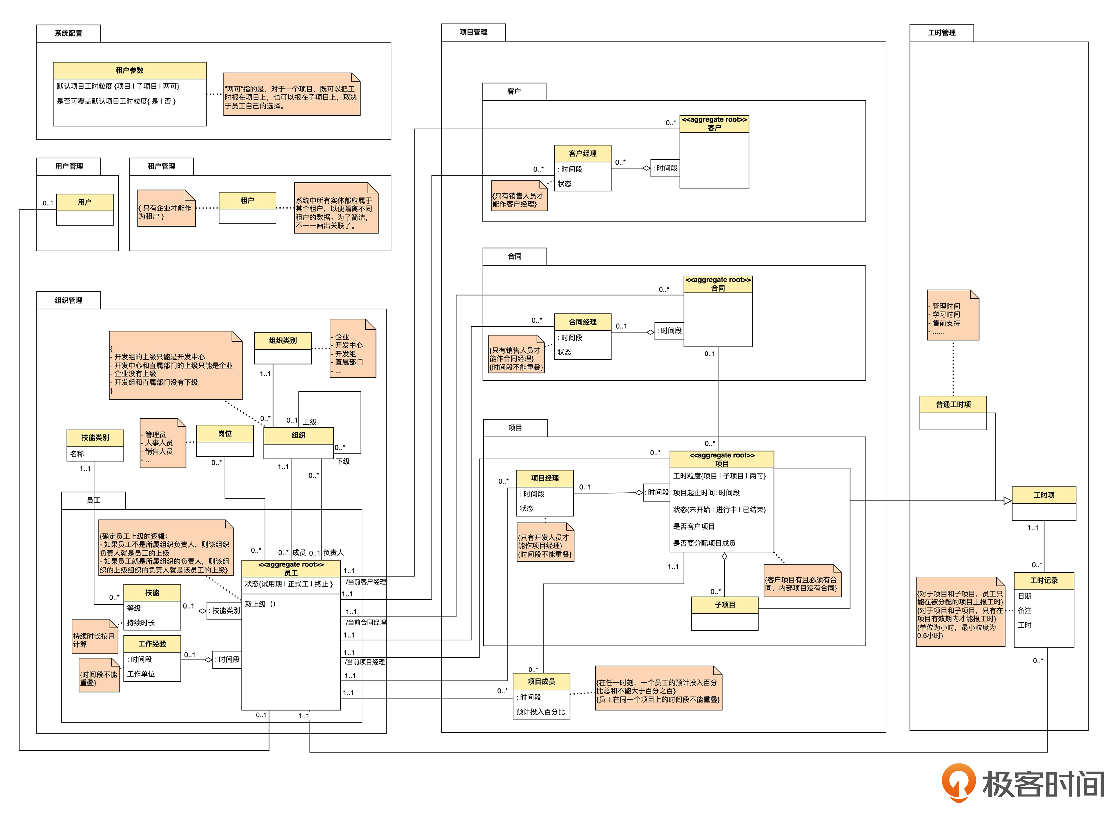 比如说,在基础信息管理上下文中,员工是一个带有技能和工作经验的聚合,同时,员工实体可能还有更多属性。而在项目管理上下文里,则不关注员工的技能和工作经验,员工里只有工号、姓名和状态三个属性就足够了。所以,尽管两个上下文里都有员工,但他们的关联和属性不同,所以这两种员工在概念上已经不一致了。