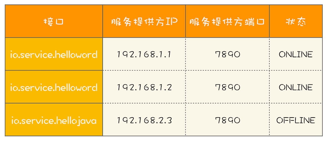 RPC框架的一个核心任务就是维护服务的路由关系,我们可以把服务的路由关系简化成下图所示的路由表。当服务提供方上线或者下线的时候,就需要更新客户端的这张路由表。