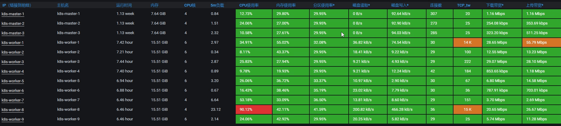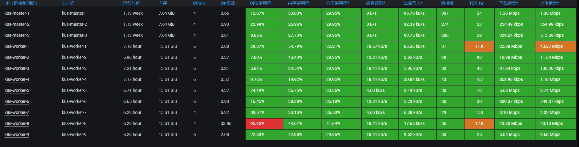 看起来不错哦,worker-8 的 CPU 使用率降到了 56.65%,同时worker-3 的 CPU 使用率升到了 70.78%。不过网络带宽有几个地方变红了,这个我们后面再分析。至少我们从这里看到,压力是起来了。