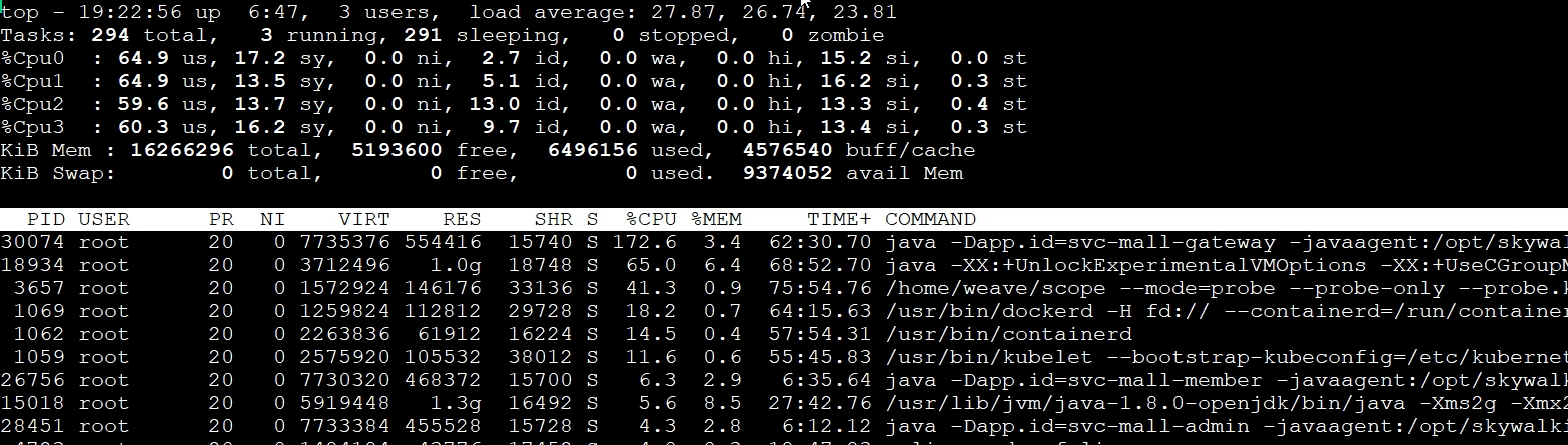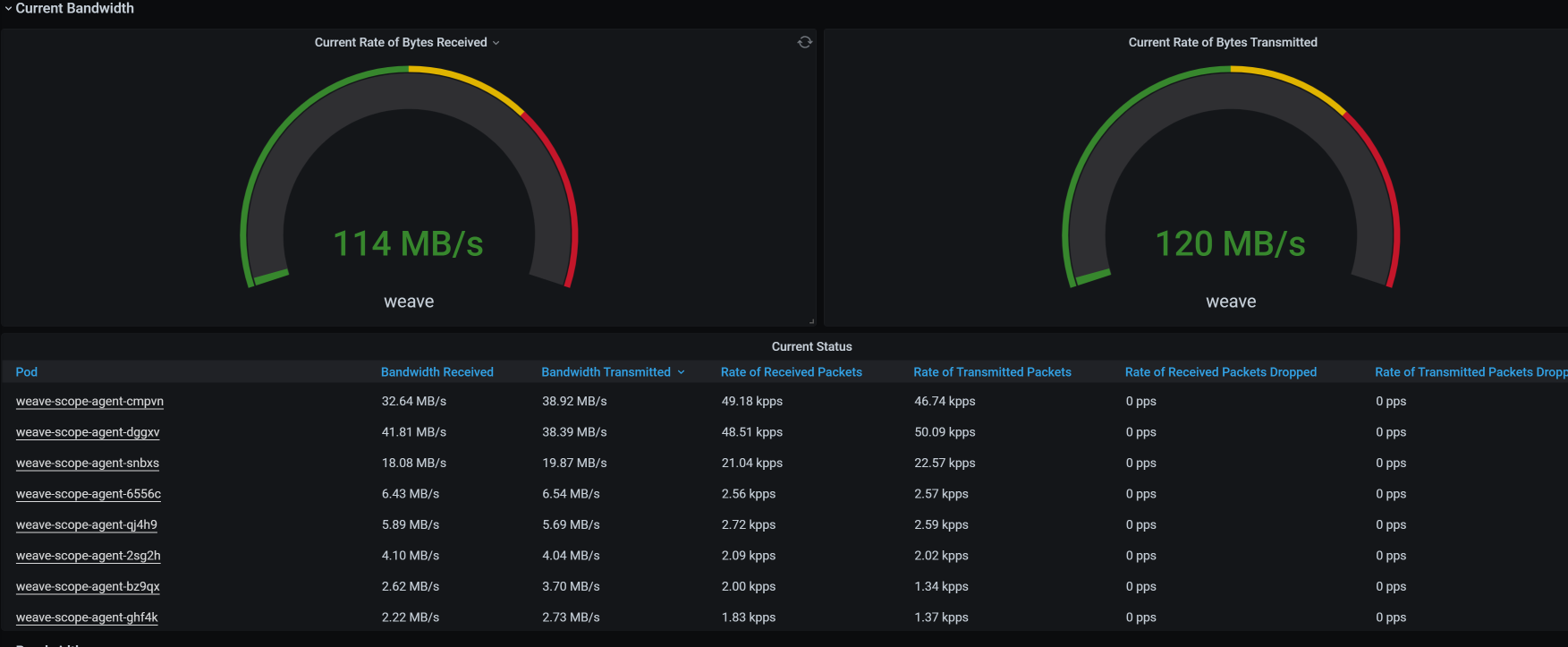 为了弄清楚那些与被测系统无关的应用,会对带宽消耗产生影响进而影响TPS,我们现在先把影响带宽的应用都删除了,比如Weave Scope、Monitoring的监控工具等,从列表中来看这些应用占了不小的带宽。