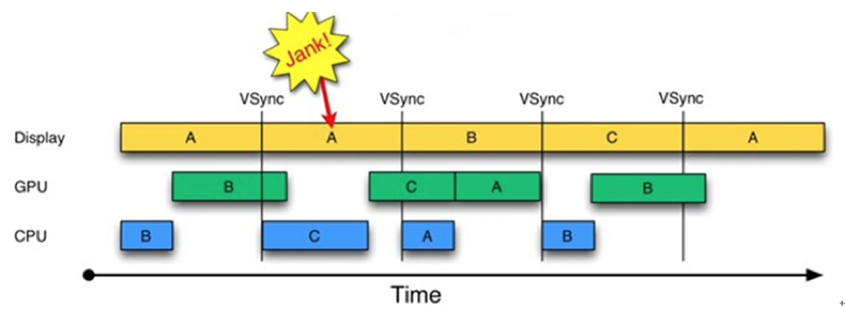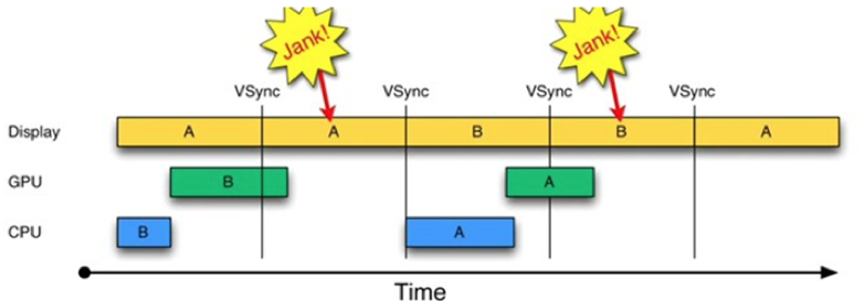 如果你理解了双缓冲机制的原理,那就非常容易理解什么是三缓冲区了。如果只有两个Graphic Buffer缓存区A和B,如果CPU/GPU绘制过程较长,超过了一个VSYNC信号周期,因为缓冲区B中的数据还没有准备完成,所以只能继续展示A缓冲区的内容,这样缓冲区A和B都分别被显示设备和GPU占用,CPU无法准备下一帧的数据。