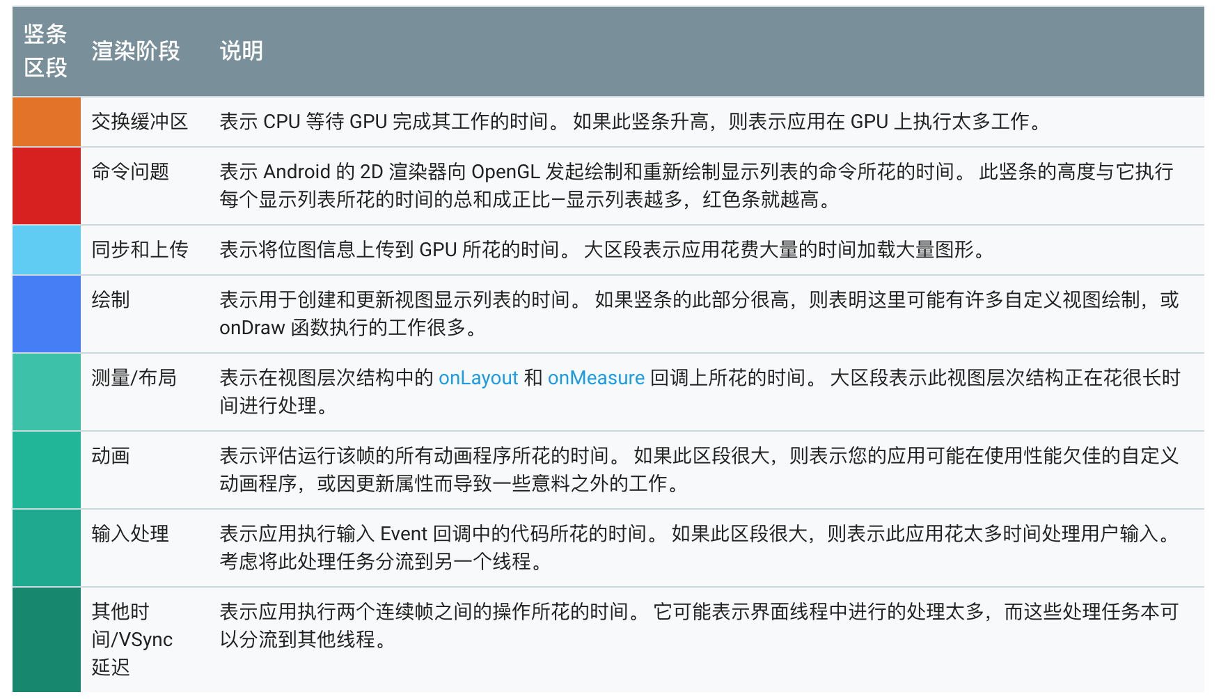 在官方文档 《检查 GPU 渲染速度和绘制过度》中,我们还可以开启Profile GPU Rendering检查。在Android 6.0之后,会输出下面的计算和绘制每个阶段的耗时: