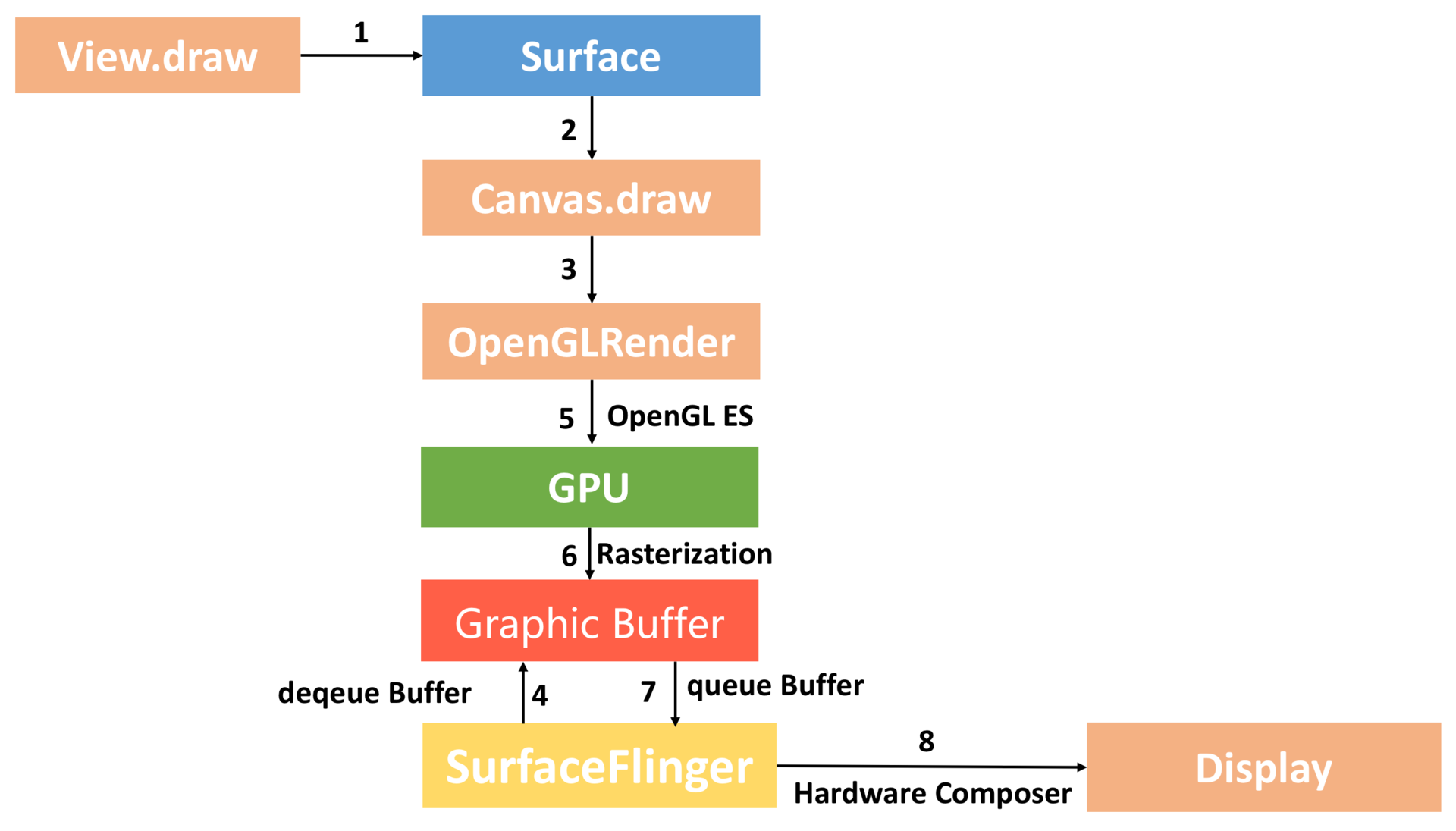 对于硬件绘制,我们通过调用OpenGL ES接口利用GPU完成绘制。OpenGL是一个跨平台的图形API,它为2D/3D图形处理硬件指定了标准软件接口。而OpenGL ES是OpenGL的子集,专为嵌入式设备设计。