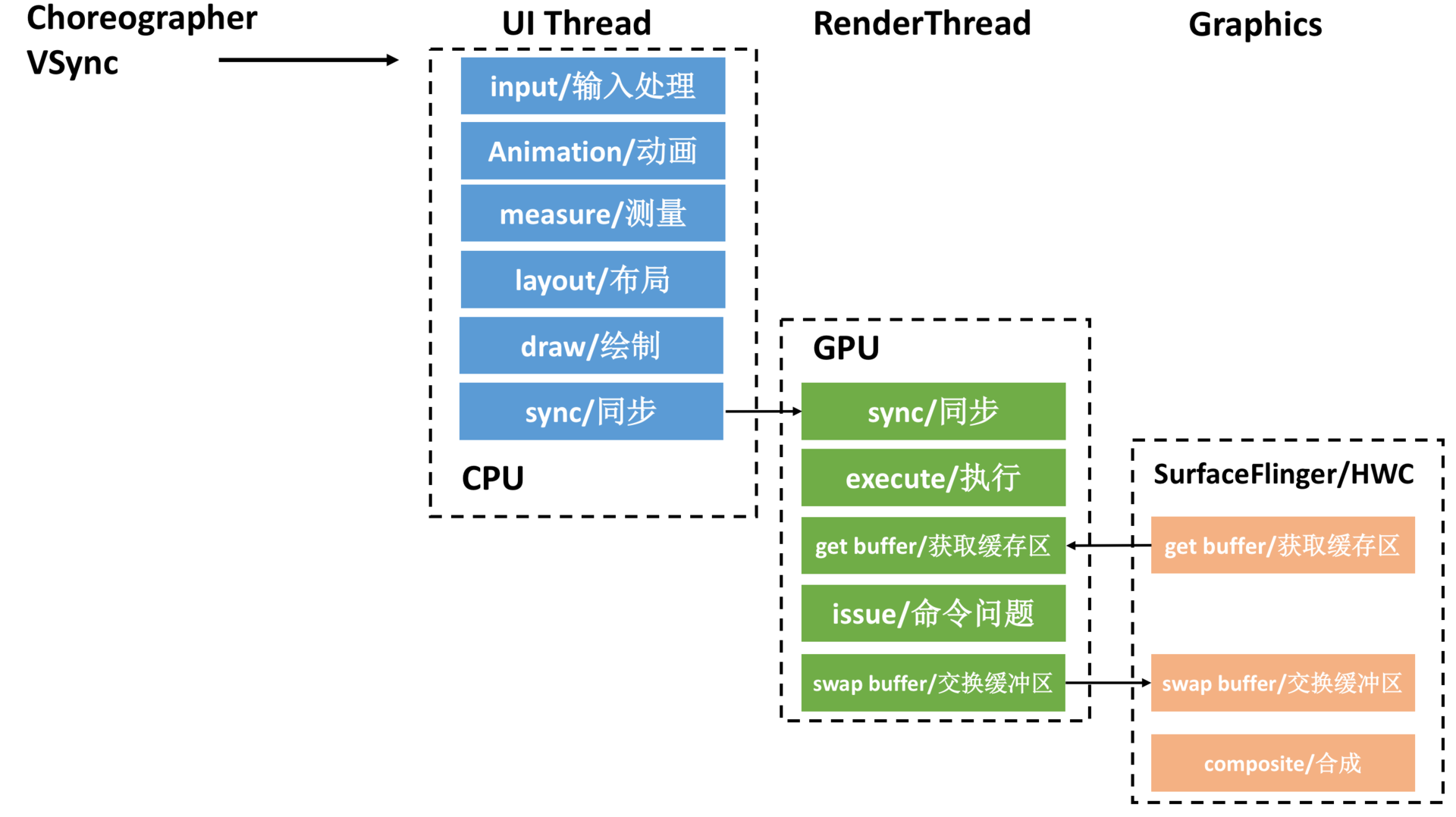 如果我们把上面的步骤转化线程模型,可以得到下面的流水线模型。CPU将数据同步(sync)给GPU之后,一般不会阻塞等待GPU渲染完毕,而是通知结束后就返回。而RenderThread承担了比较多的绘制工作,分担了主线程很多压力,提高了UI线程的响应速度。