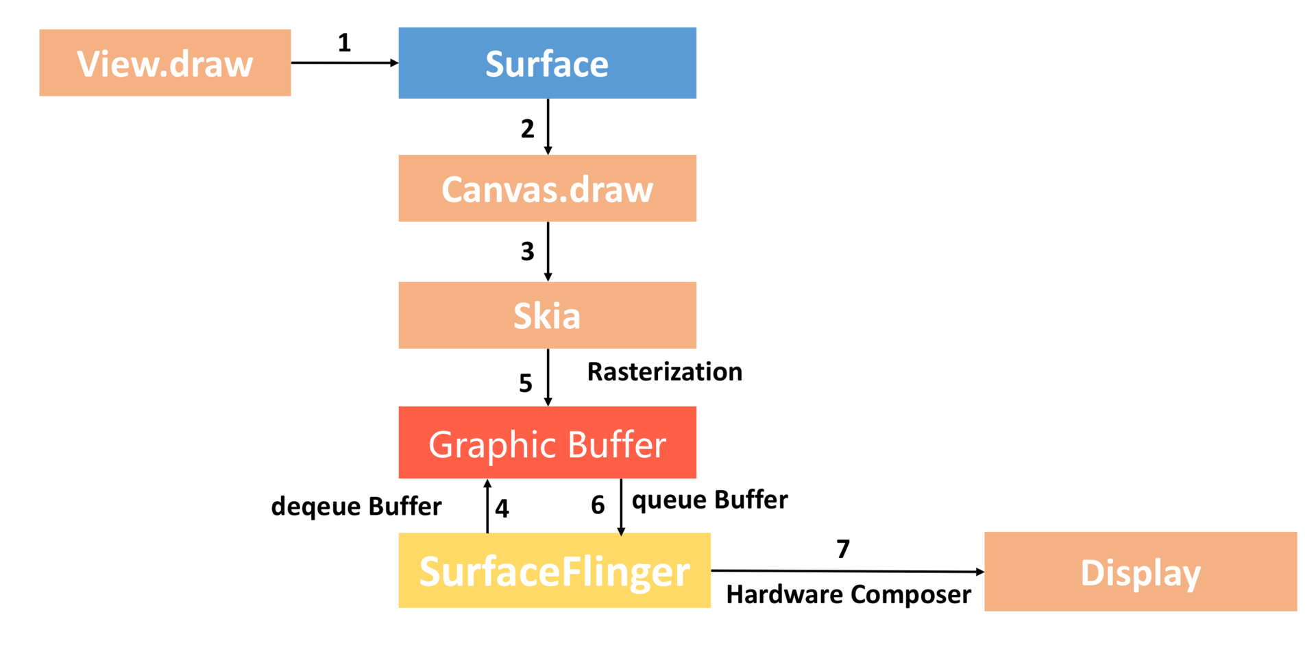 - SurfaceFlinger。通过Swap Buffer把Front Graphic Buffer的内容交给SurfaceFinger,最后硬件合成器Hardware Composer合成并输出到显示屏。