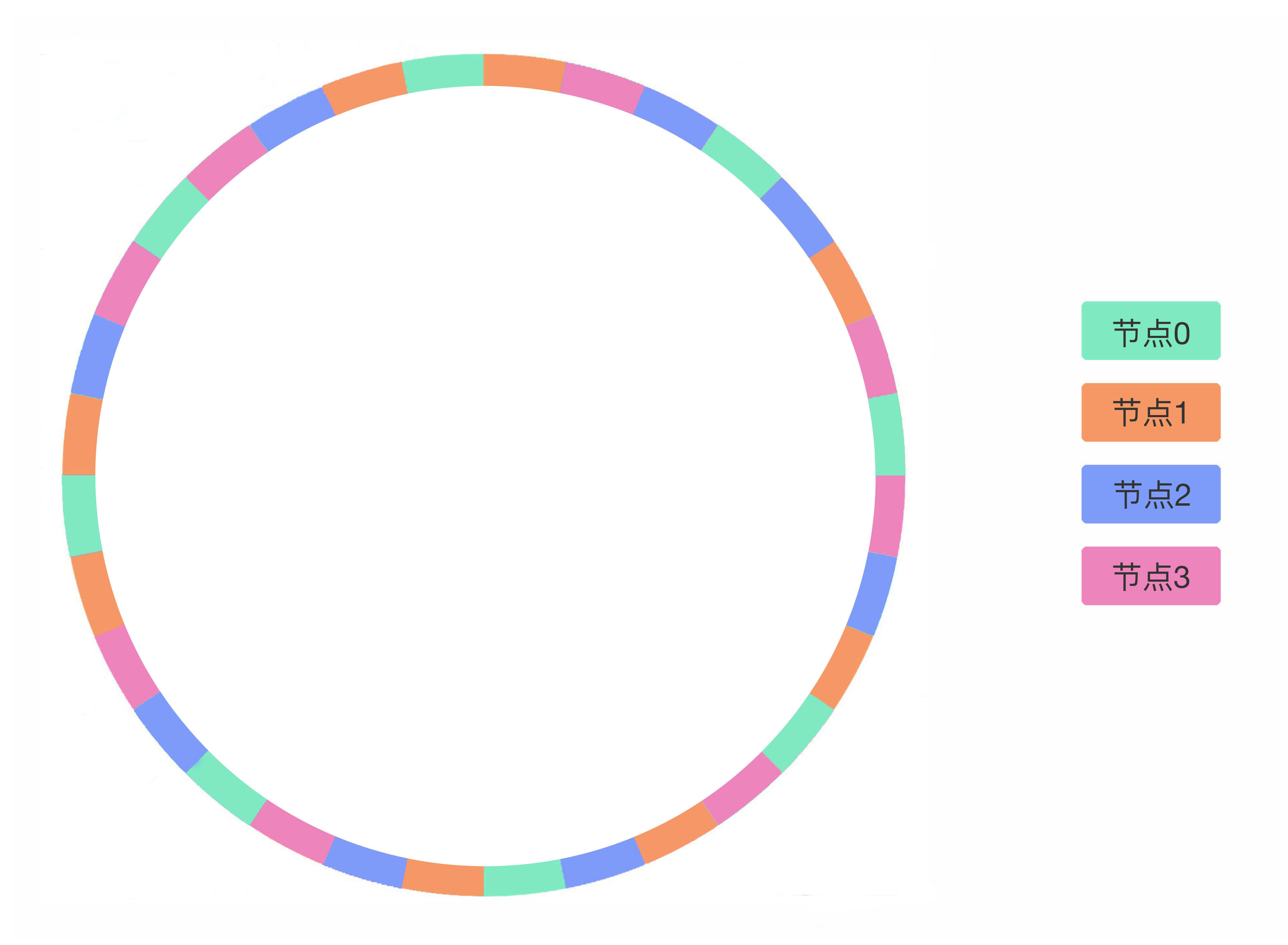 那如何提高均衡性呢?**在真实的数据节点与哈希环之间引入一个虚拟节点层,就可以解决上述问题。**例如下图中的集群含有4个节点,但我们并不直接将哈希环分为4份,而是将它均匀地分为32份并赋予32个虚拟节点,因此每个虚拟节点会处理 ${2^{27}}$ 个哈希值,再将32个虚拟节点通过某个哈希函数(比如CRC32)映射到4个真实节点上(比如图中8个绿色虚拟节点皆由同色的主机节点0处理):