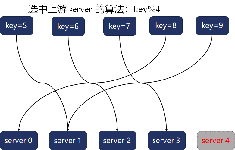 这个方案实现简单,运算速度也快,但它最大的问题是在系统扩容或者缩容时,必须迁移改变了映射关系的数据。然而,取模哈希函数中基数的变化,往往会导致绝大部分映射关系改变,比如上例中的5个关键字,在下图中集群节点数(即基数)从5降为4时,原映射关系全部失效,这5条数据都得迁移到其他节点: