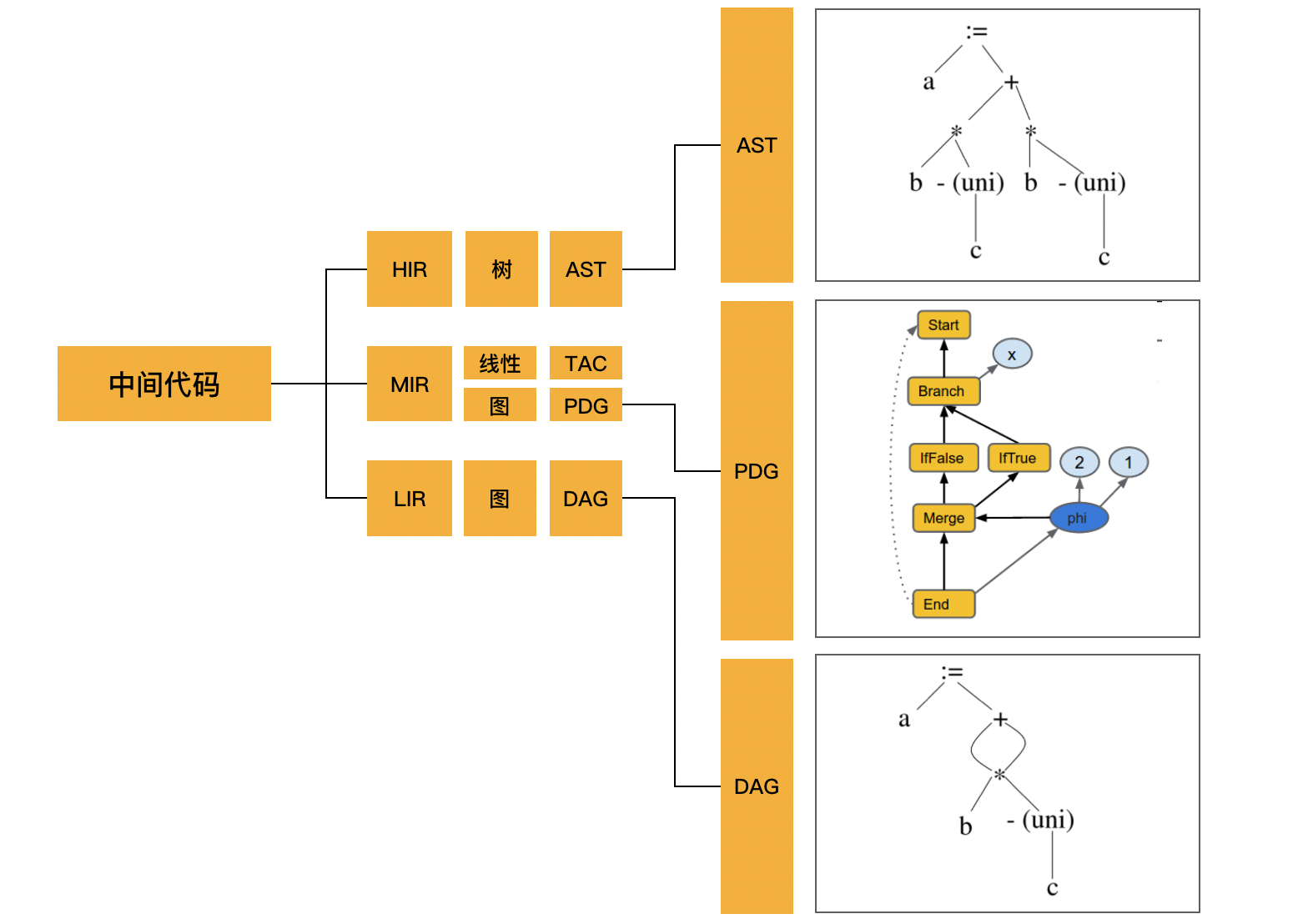 前面我们说了,中间代码可以分为高、中、低三个不同的抽象层次。HIR主要用于基于源语言做的一些分析和变换,比较典型的例子就是用于语义分析的的AST(Abstract Syntax Parser)语法树。MIR则是独立于源语言和 CPU 架构来做一些分析和优化,比较典型的例子就是三地址代码 TAC(Three Address Code)和程序依赖图 PDG(Program Dependency Graph),它们主要用于分析和优化算法的部分。LIR这一层则是依赖于 CPU 架构做优化和代码生成,其中比较典型的例子就是有向无环图 DAG(Directed Ayclic Graph),它的主要目的是帮助生成目标代码。