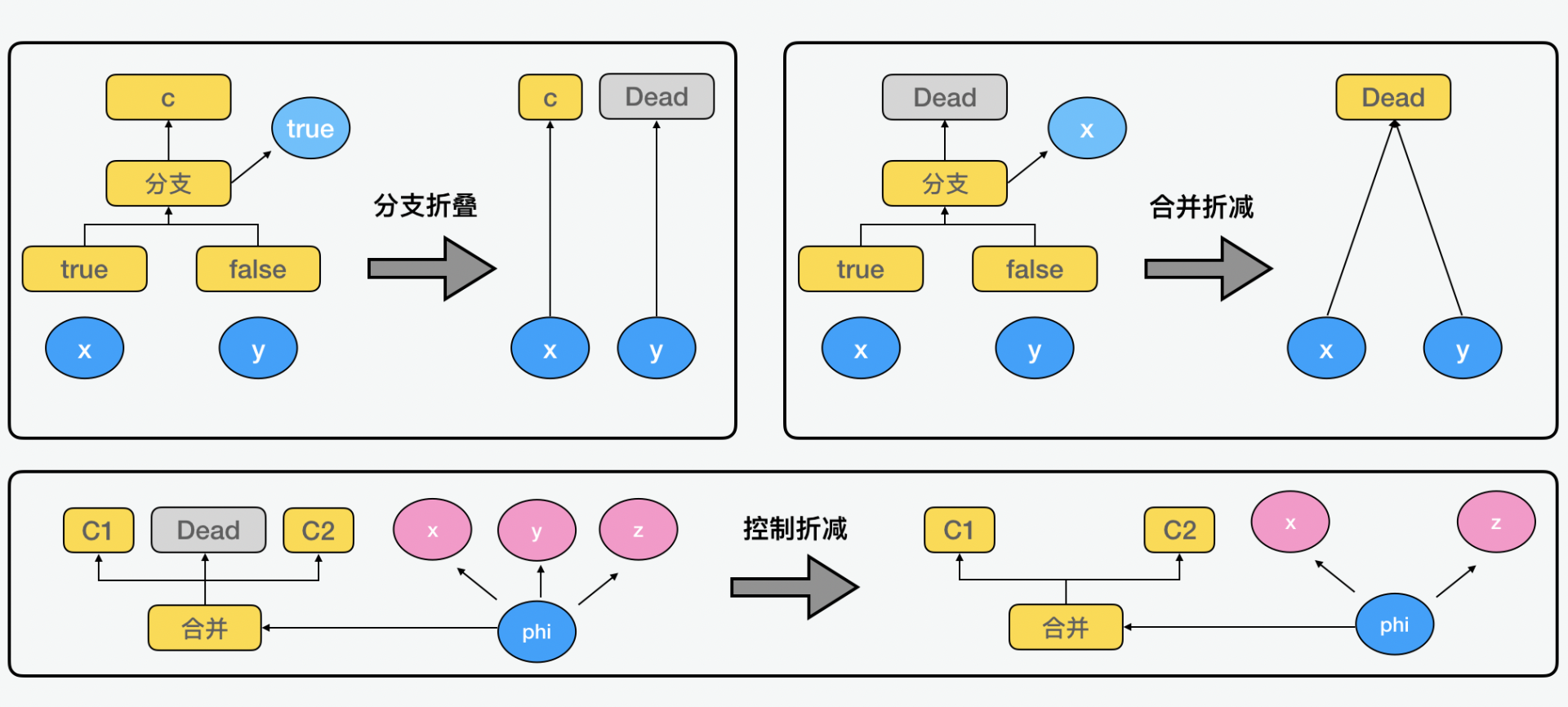 针对控制流,也有很多不同的优化方式。下面是几个例子,包含了分支折叠、合并折减、控制折减。通过这几个例子就可以看到,无论流程本身,还是流程中的分支和合并在优化后,都简化了很多。