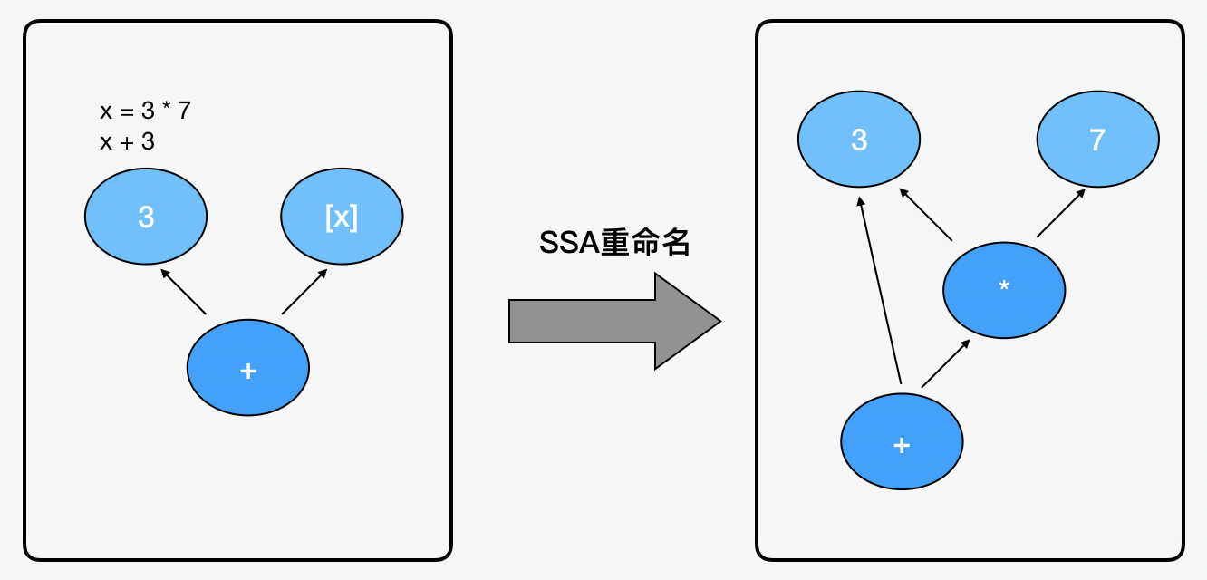 说完了结构,我们再来看看格式。SoN是符合静态单赋值(SSA,static single assignment)格式的。什么是静态单赋值呢?顾名思义,就是每个变量只有唯一的赋值。比如下面的例子里,第一个操作是x等于3乘以7,之后我们给x加3。这时,x变量就出现了两次。所以TurboFan在创建图的时候会给本地变量做重命名,在改完之后就是3这个值的节点同时有两个操作符指向它,一个是乘以7的结果,一个是结果再加上3。在SoN中没有本地变量的概念,所以变量被节点取代了。